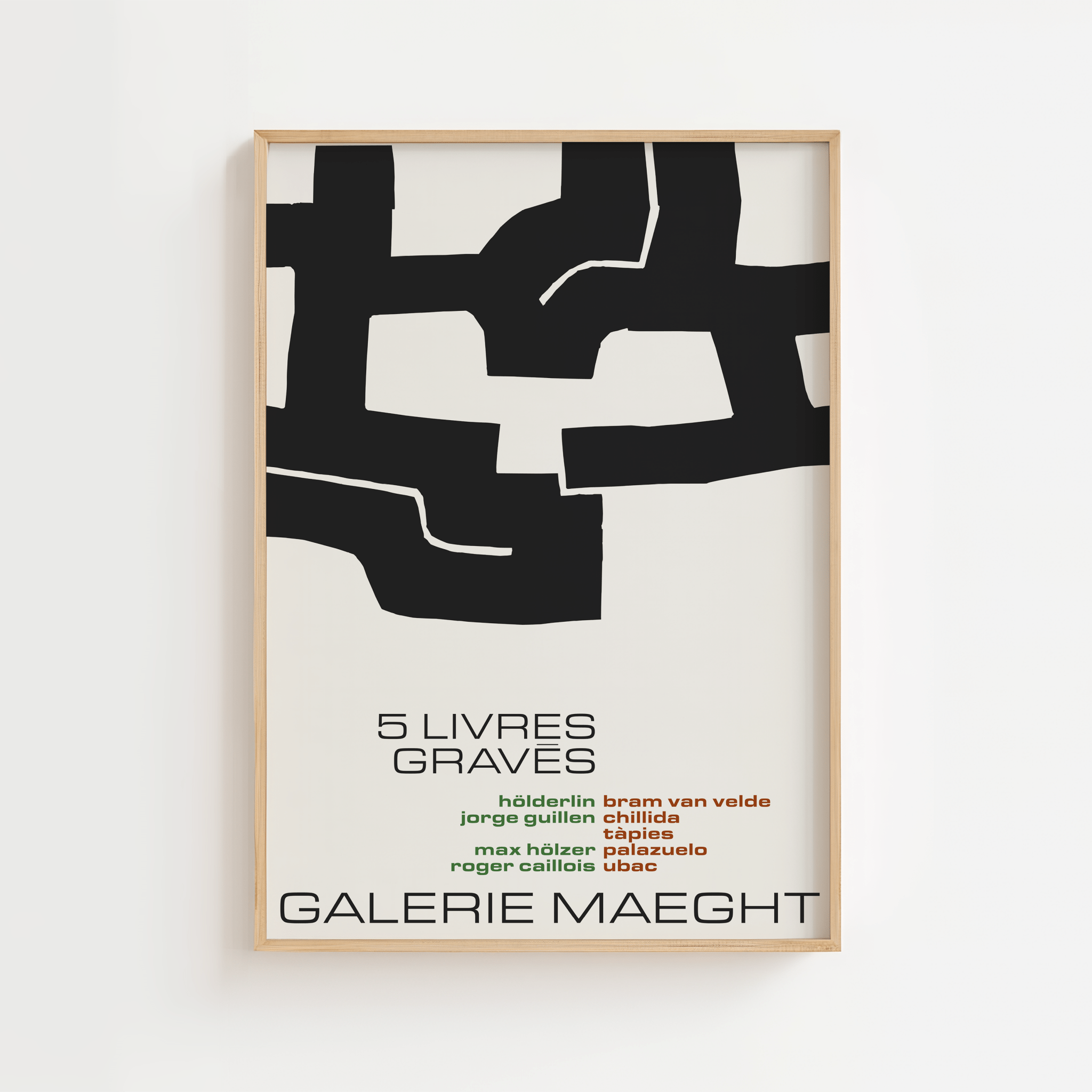 Das Poster der Galerie Maeght 5 Livres ist eine zeitlose Hommage an klassische Kunst und Design. Das Poster ist von der berühmten Kunstinstitution Galerie Maeght inspiriert und mit eleganten Details verziert, die die Tiefe und Schönheit der Kunst betonen.