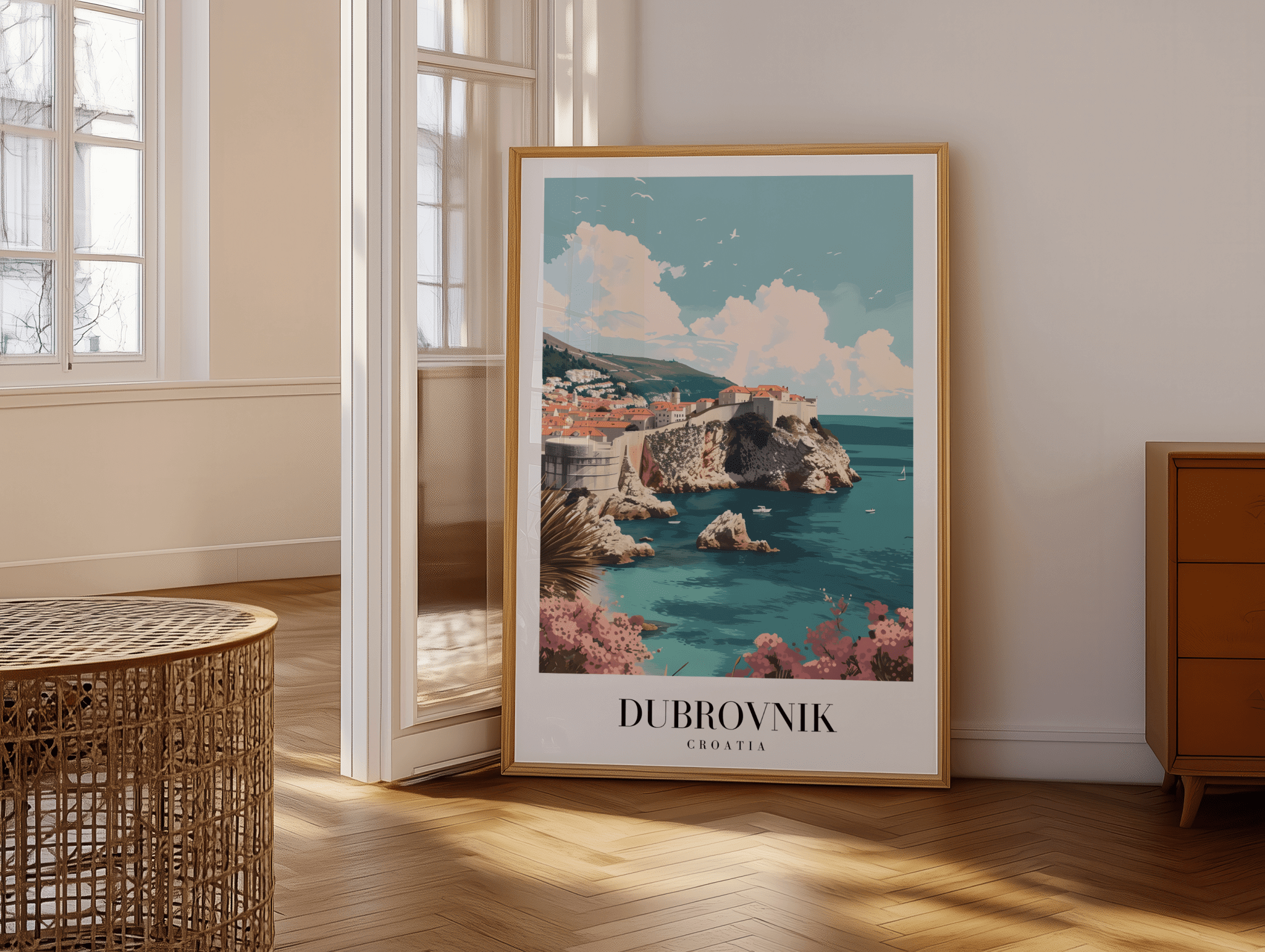 Denne rejseplakat indfanger atmosfæren i Kroatiens perle, hvor historie og naturskønne omgivelser smelter sammen. Plakaten passer perfekt i stuen, soveværelset eller som del af en billedvæg med andre byplakater fra verdens smukkeste destinationer.
