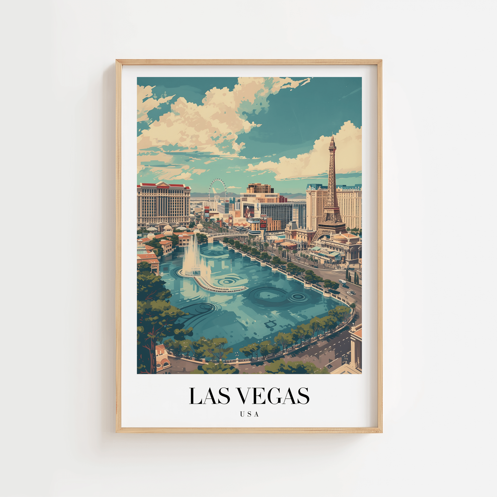 Bring glitter og glamour ind i dit hjem med vores Las Vegas plakat, der fanger den ikoniske skyline med The Strip, Bellagio-fontænerne og byens berømte hoteller. En Las Vegas byplakat er oplagt til dig, der elsker USA, rejser og storbylivets energi.