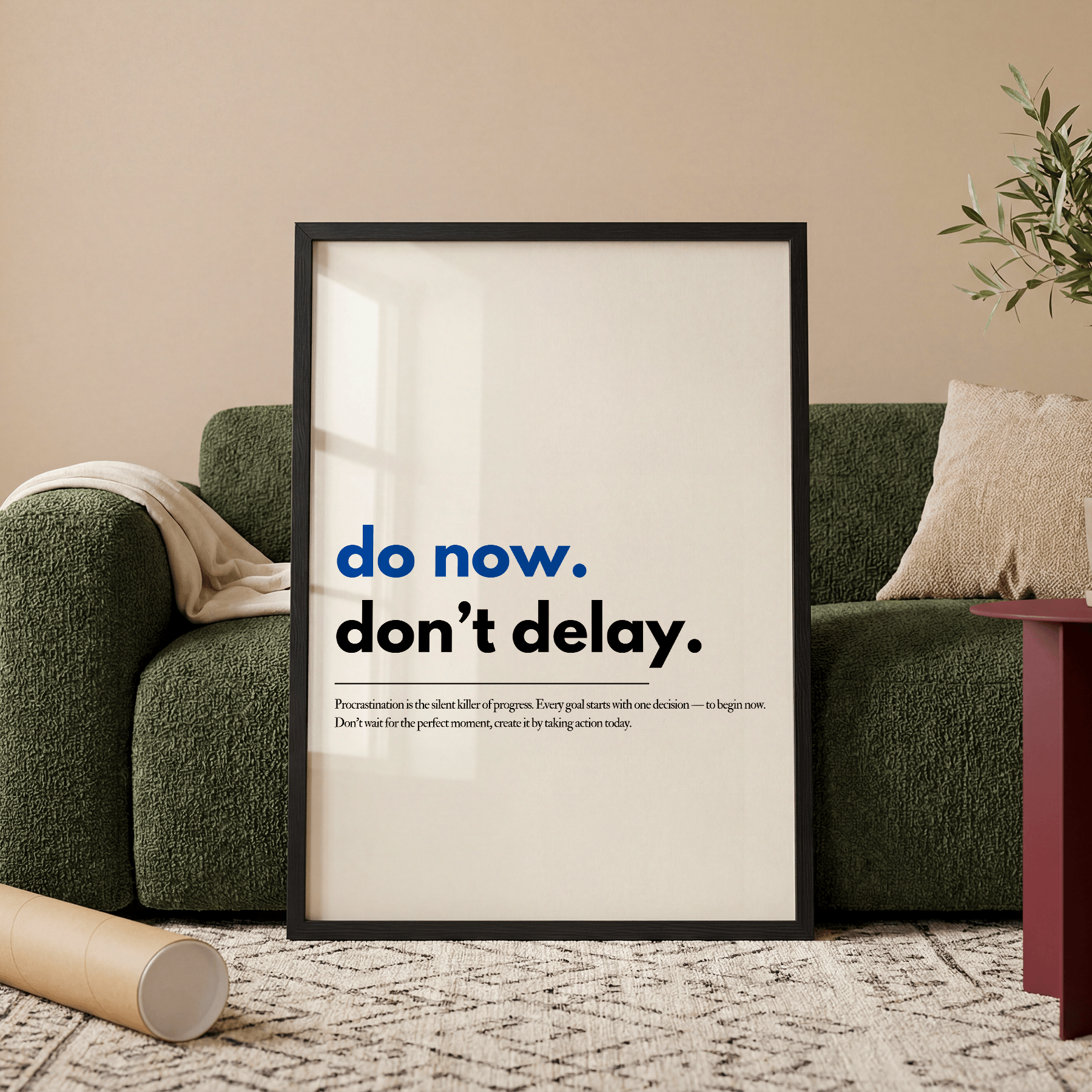 Denne motiverende plakat med citatet “Do now. Don’t delay.” er en stærk påmindelse om at handle nu i stedet for at vente.