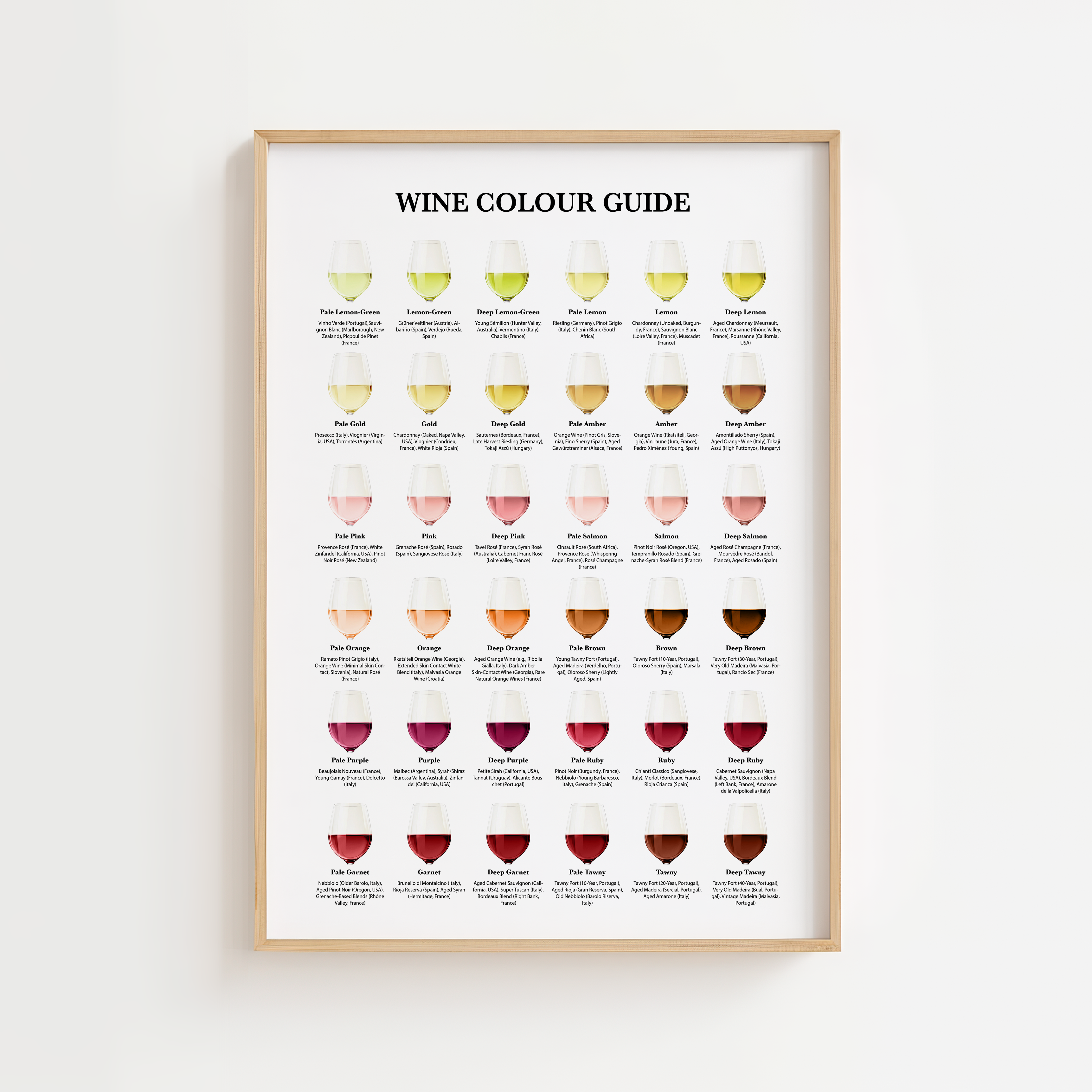 Opgrader dit køkken eller hjemmebar med denne Wine Colour Guide Plakat – en smuk og informativ oversigt over forskellige vinfarver fra hvidvin og rosé til fyldige rødvine. Plakaten viser hver nuance i et stilrent glasikon med letlæselige beskrivelser, der gør den både dekorativ og lærerig.