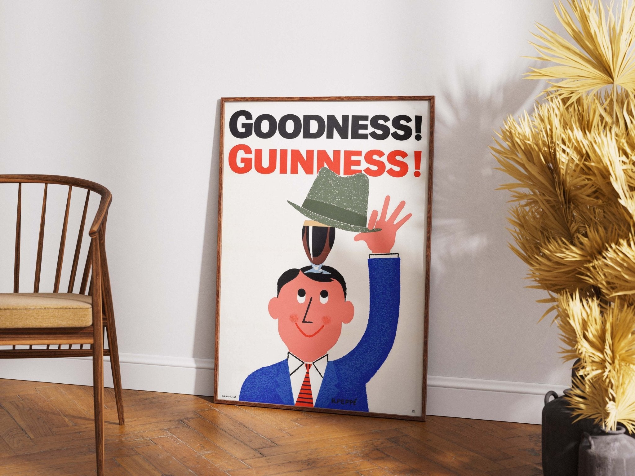 Denne sjove og charmerende vintage Guinness plakat bringer både farver, finurlighed og klassisk britisk humor ind i dit hjem. Motivet forestiller en mand i blå jakkesæt, der fanger en øl under sin hat, akkompagneret af teksten “Goodness! Guinness!”. Det grafiske udtryk er legende og stilrent – og gør denne retroplakat til et oplagt valg til barhjørnet, herreværelset, caféindretning eller som gave til Guinness-elskeren. En ikonisk reklameplakat, der emmer af vintage charme og 50’er-stemning.