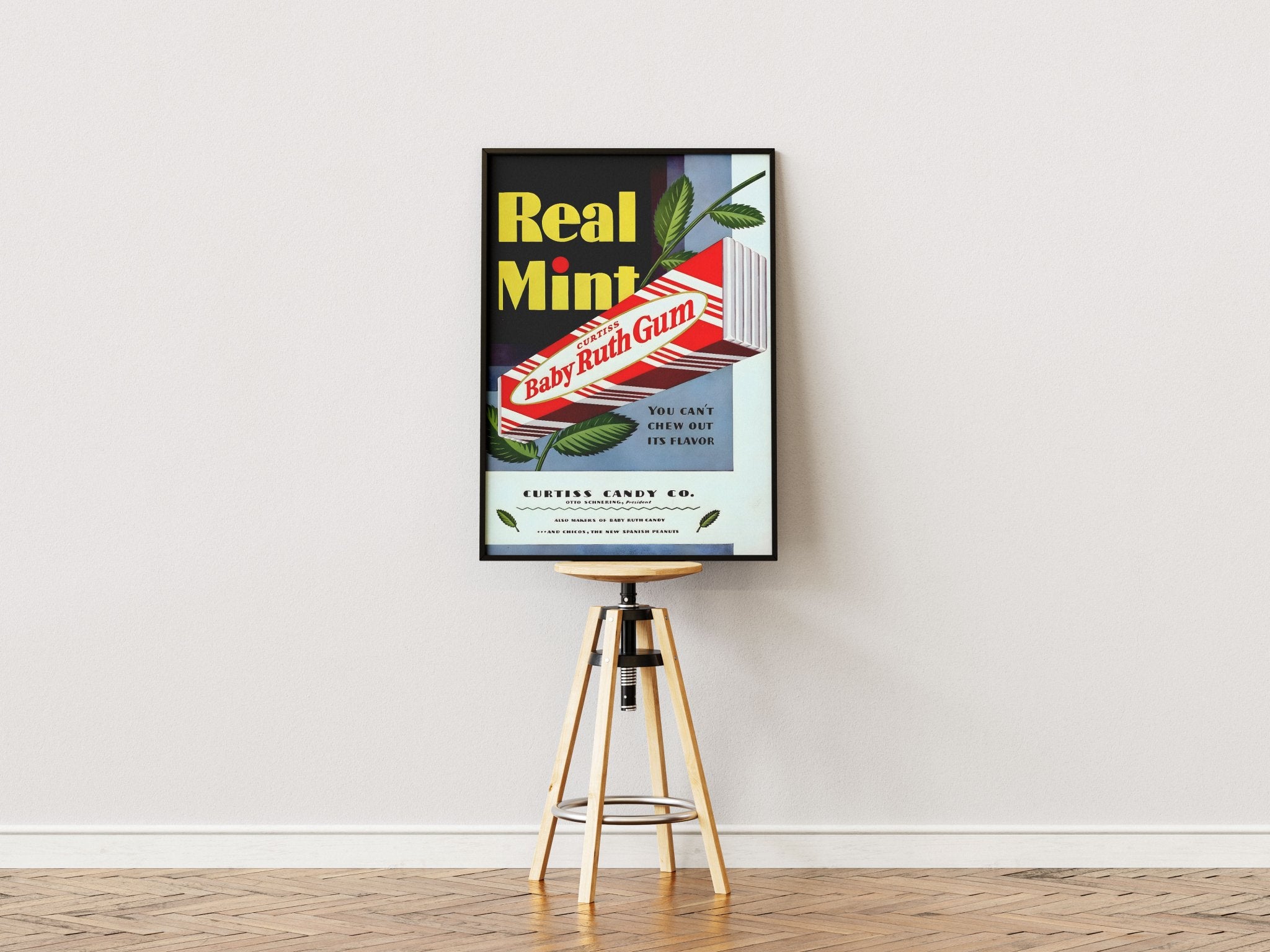 Denne farverige vintage plakat fra Curtiss Candy Co. reklamerer for tyggegummiet Baby Ruth Gum med ægte mintsmag – “You can’t chew out its flavor”. Det klassiske design kombinerer mintblade og den ikoniske røde og hvide tyggegummipakke med et klart reklamebudskab og en ægte retro æstetik. Plakaten emmer af 50'er-stemning og amerikansk nostalgi, hvilket gør den perfekt til køkkenet, caféhjørnet eller til samlere af vintage reklamekunst. Et festligt og grafisk element til hjemmet – både for mintelskere og retrofans!