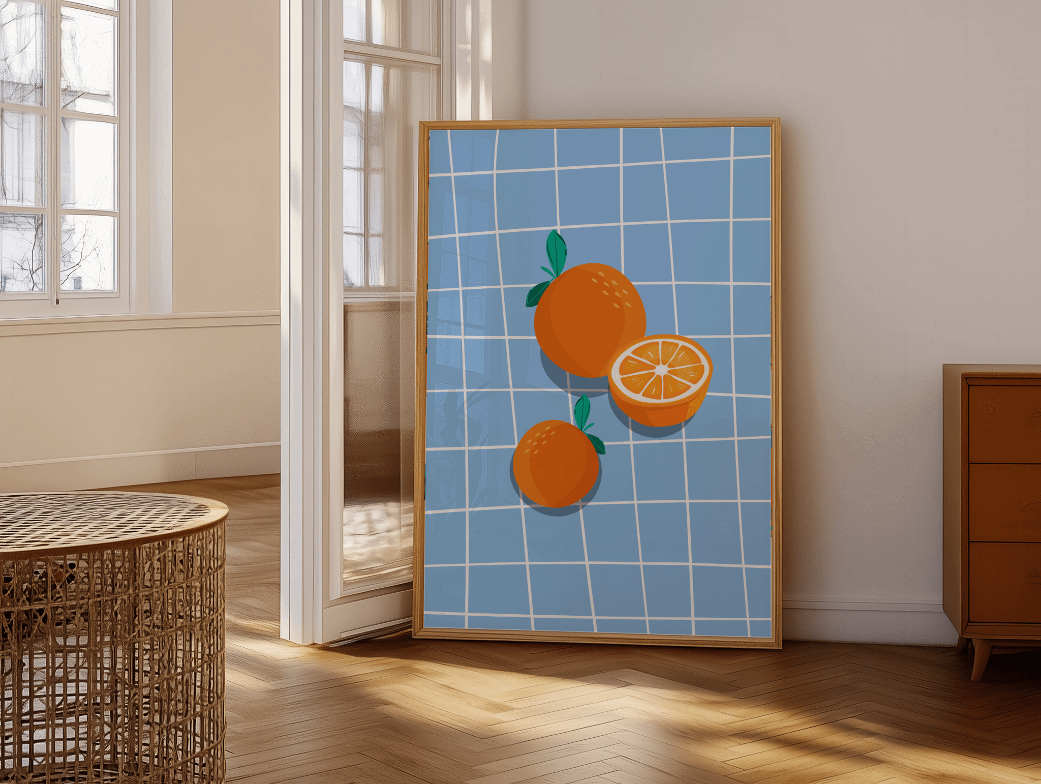 Bring friskhed og farve ind i hjemmet med Oranges on Blue Plakat. Motivet viser tre saftige appelsiner – heraf én halveret – på en klar blå baggrund med hvide tern. Det enkle grafiske design skaber et moderne og legende udtryk, som passer perfekt til både køkken, stue eller en farverig billedvæg.