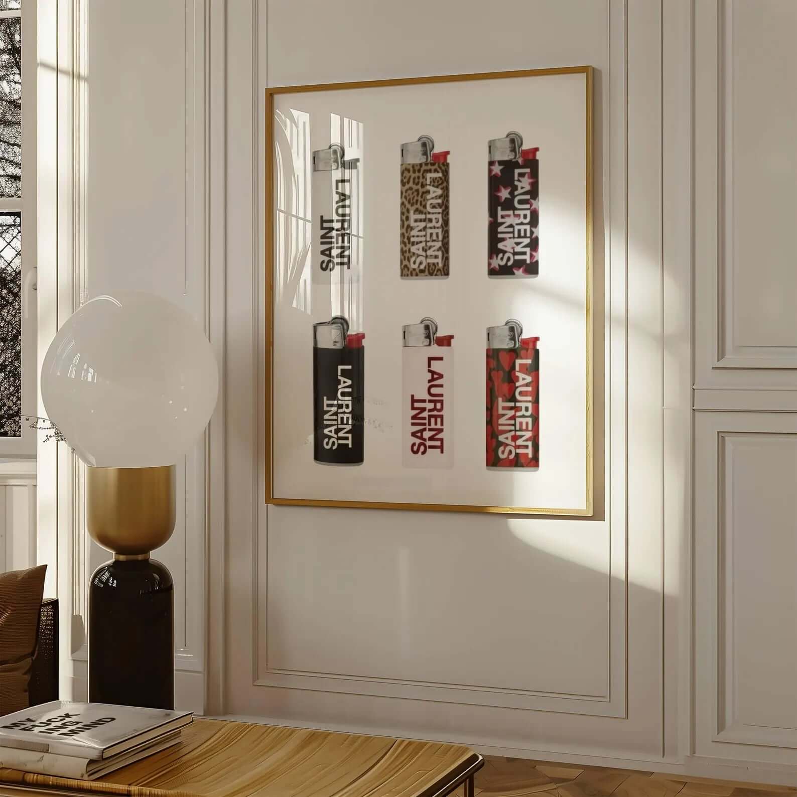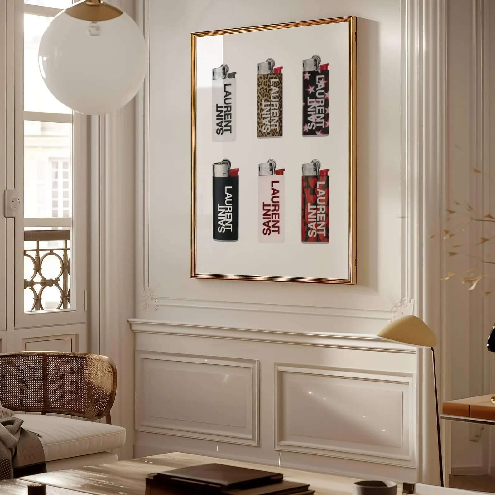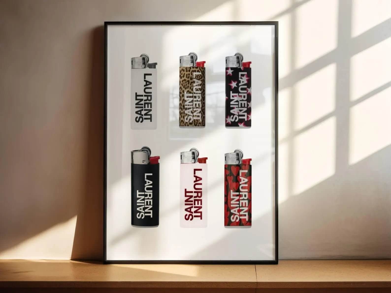 Bring luxury and attitude into your home with the Luxury Flames – Fashion Poster . The motif shows an artistic interpretation of exclusive designer lighters, inspired by Saint Laurent and the high fashion universe. The poster combines modern pop culture with luxurious aesthetics and is perfect for creating a strong statement in your home.