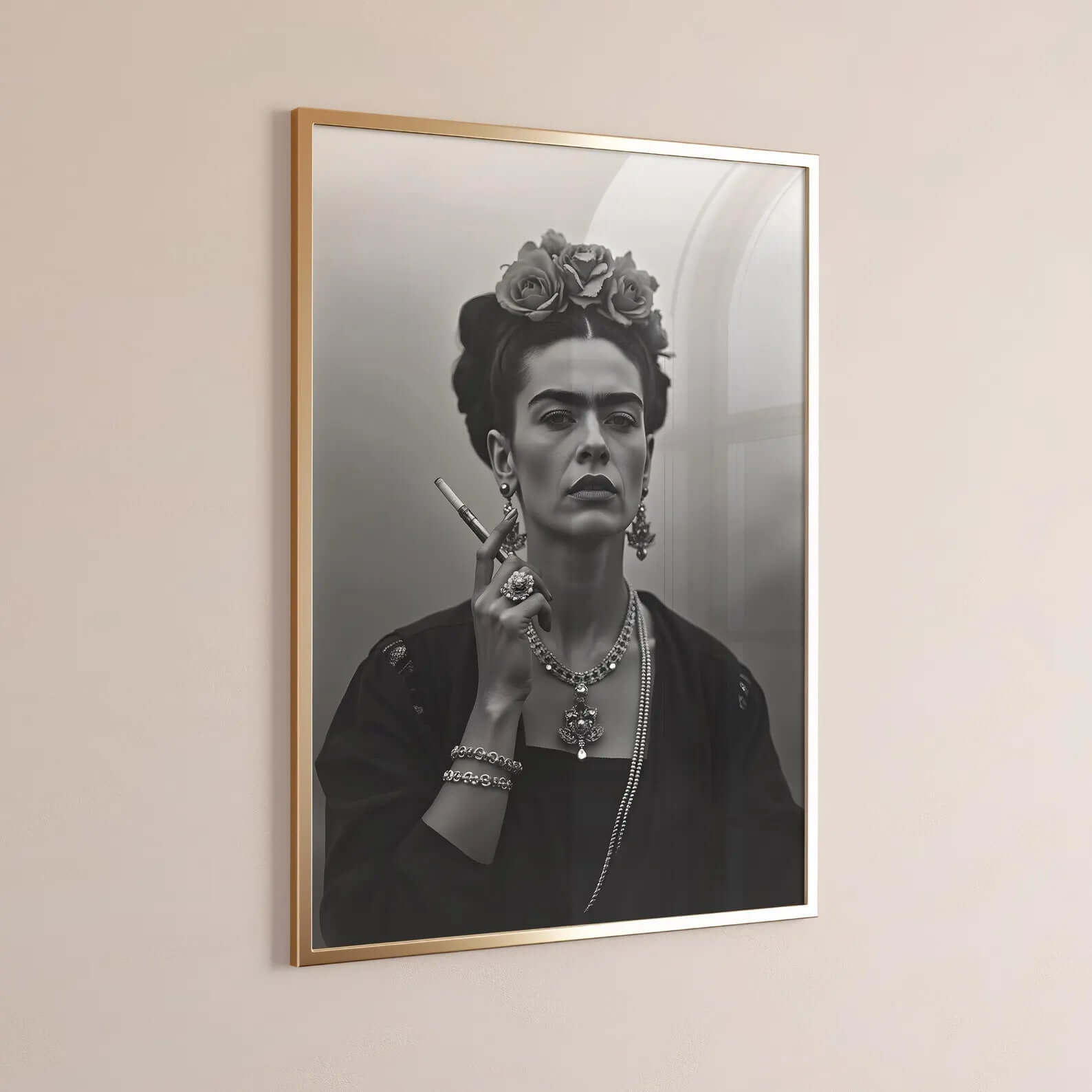 Give your interior a touch of edge and personality with Smoking Icon - Frida Kahlo Poster . The black and white motif shows Frida Kahlo in an iconic and powerful moment, where her strength and attitude stand out clearly.