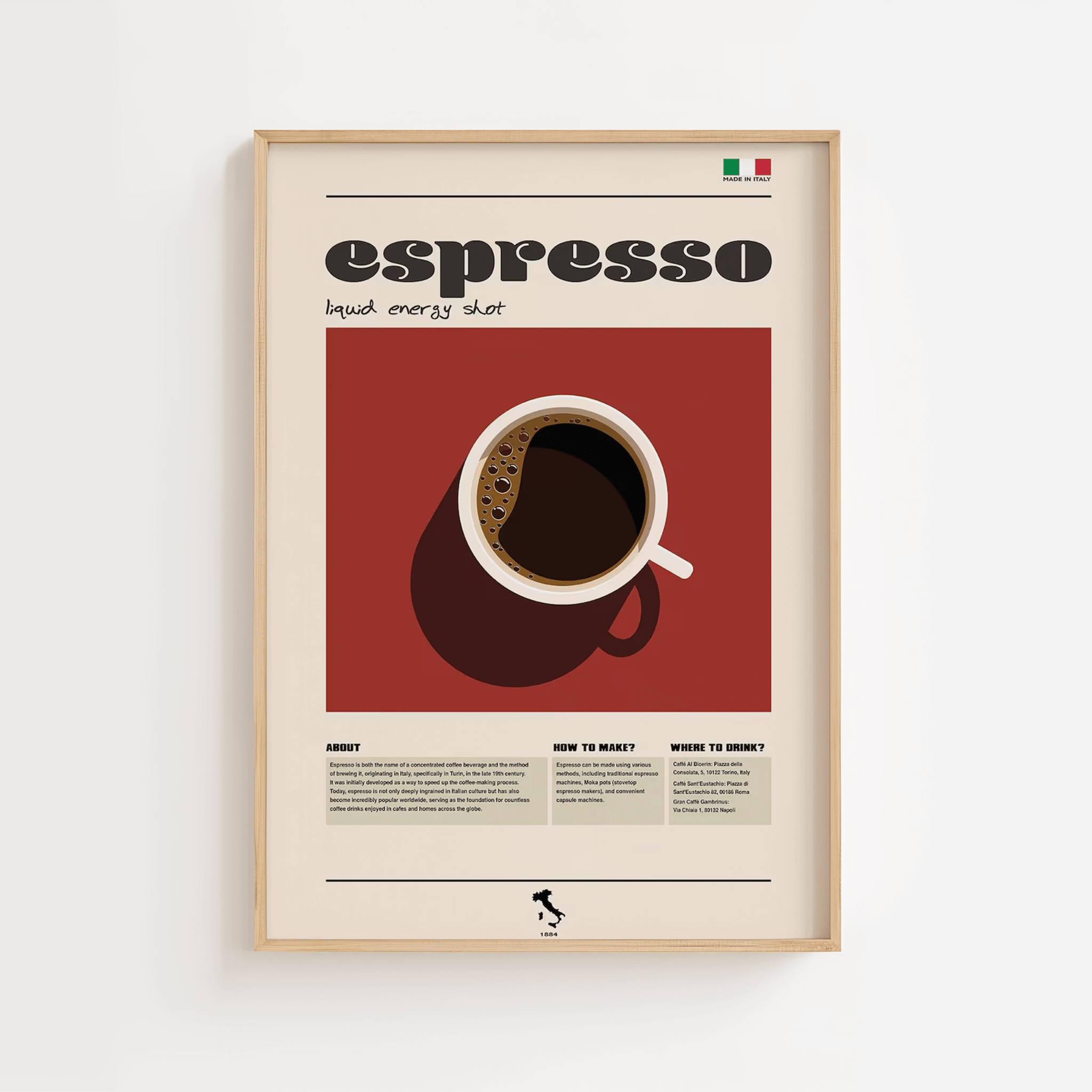 Denne grafiske og retro-inspirerede espresso plakat viser en smuk kop espresso set ovenfra, sat mod en varm, rød baggrund, kombineret med små sektioner om espressoens historie, hvordan man brygger den, og hvor man kan smage den bedste espresso i Italien.