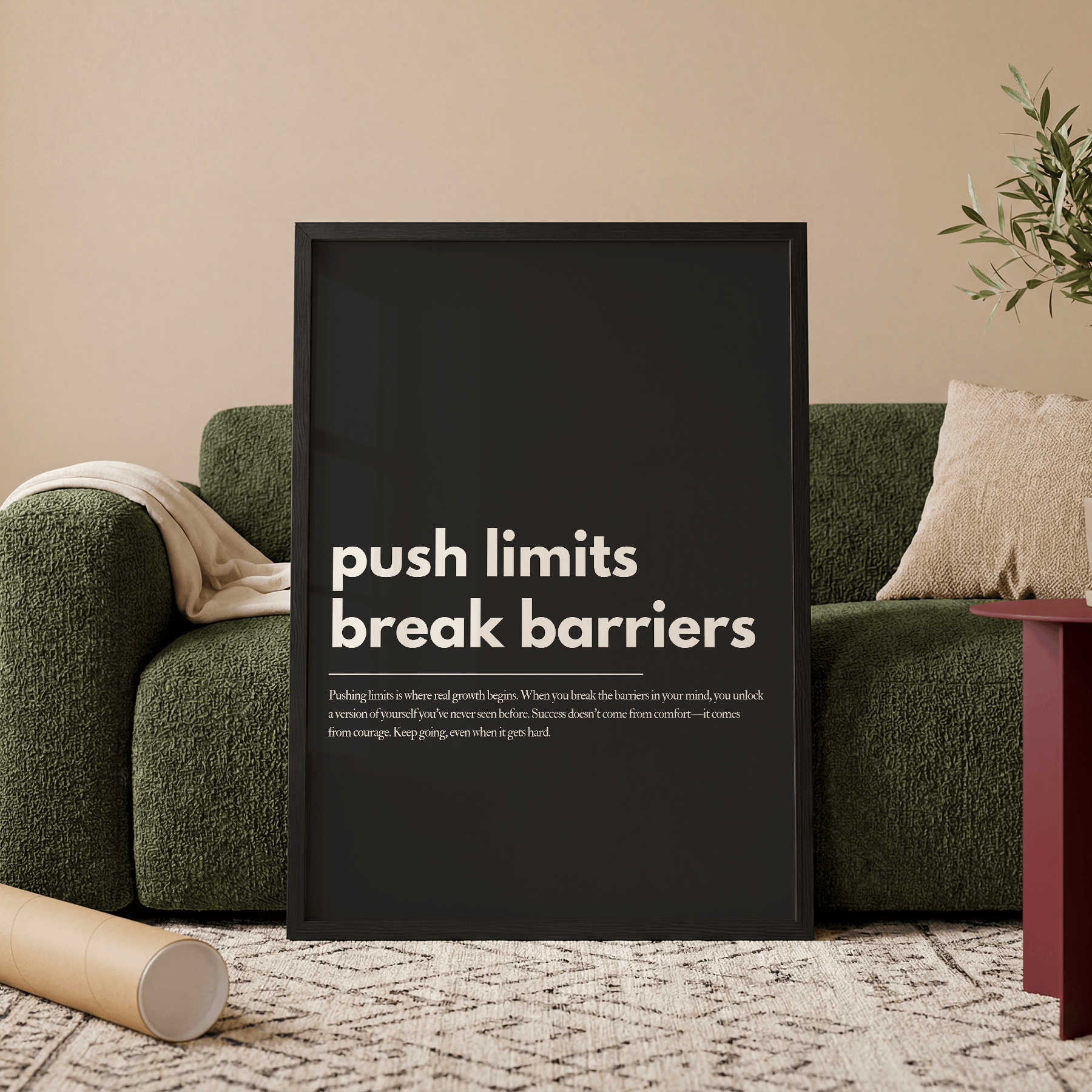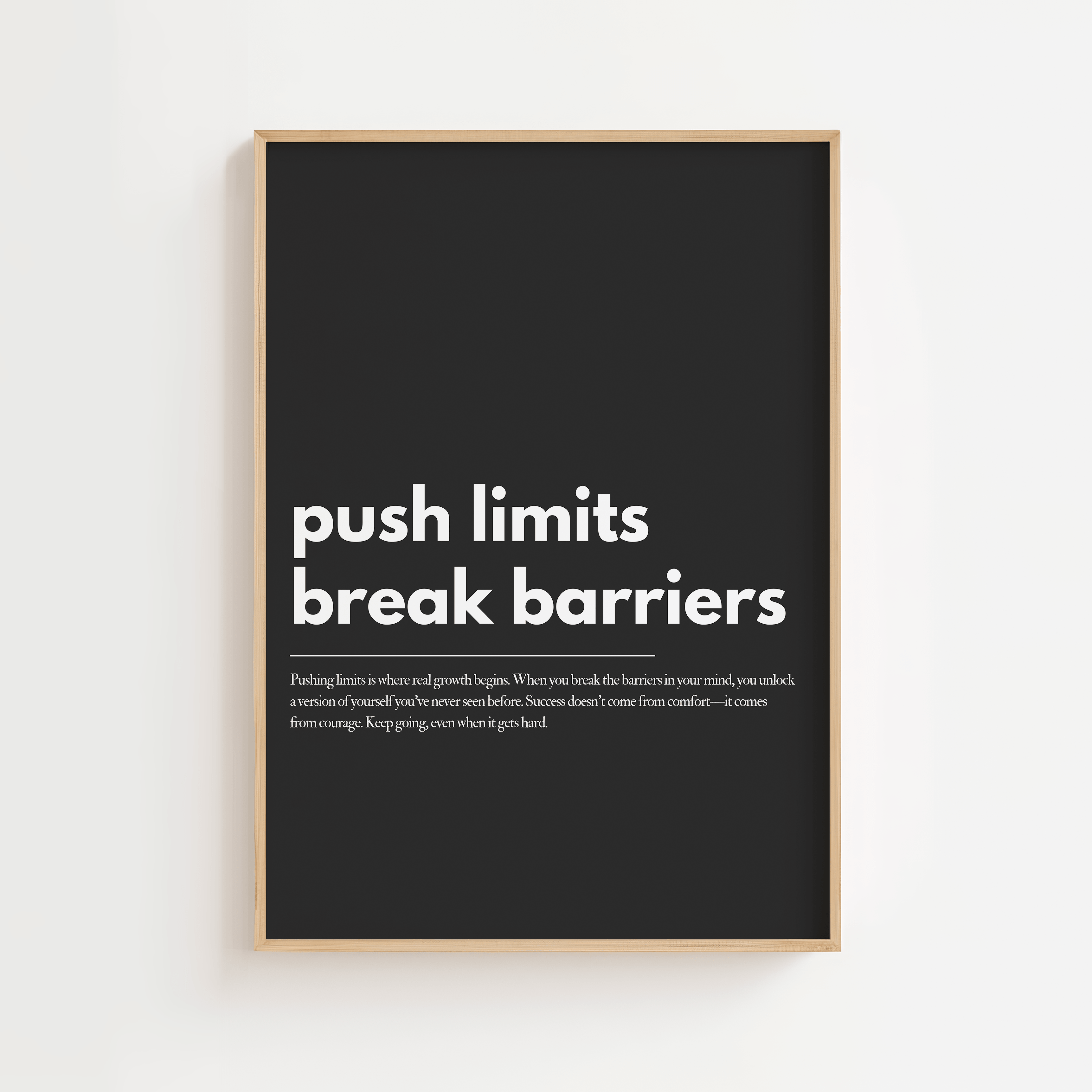 Denne motiverende plakat med citatet “Push limits, break barriers” handler om at udfordre dine grænser og overvinde de barrierer, der står i vejen for dine mål.