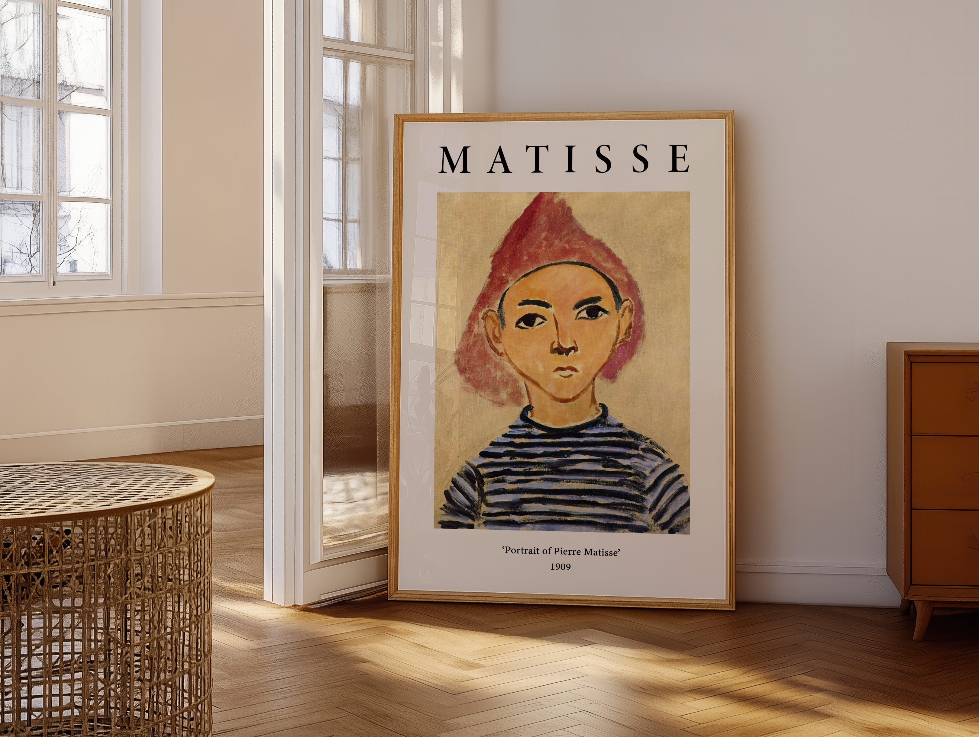 Bring kunsthistorien helt tæt på med Portrait of Pierre – Matisse Plakat, et af Henri Matisses mest elskede portrætter fra 1909. Motivet viser kunstnerens søn Pierre i en stribet trøje og med karakterfulde træk, malet i Matisses ikoniske, udtryksfulde stil.