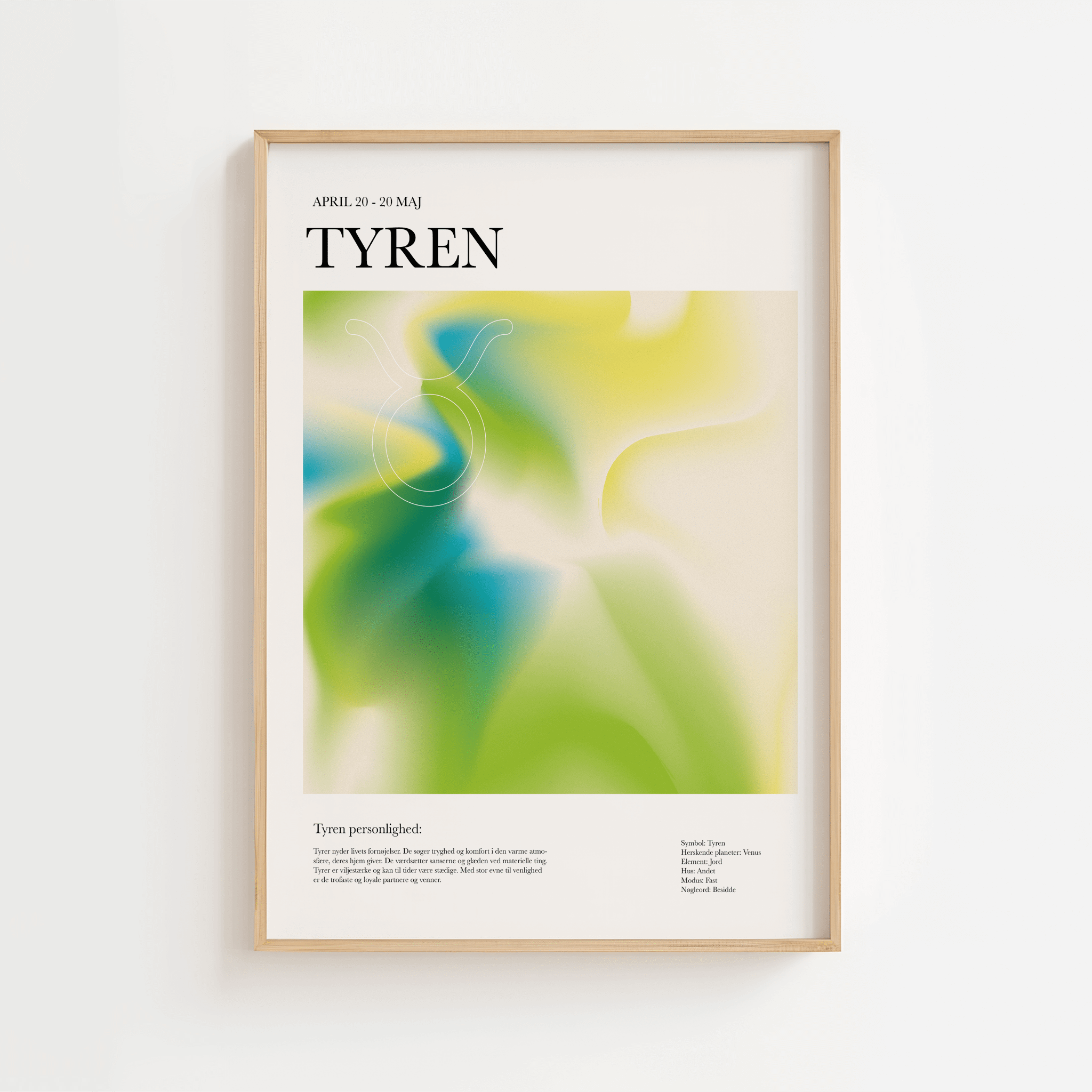 This colorful Taurus zodiac sign poster captures the essence of stability, beauty, and strength. Taurus is known for its grounding, enjoyment, and perseverance – and this is reflected in the design with soft shapes and warm colors.