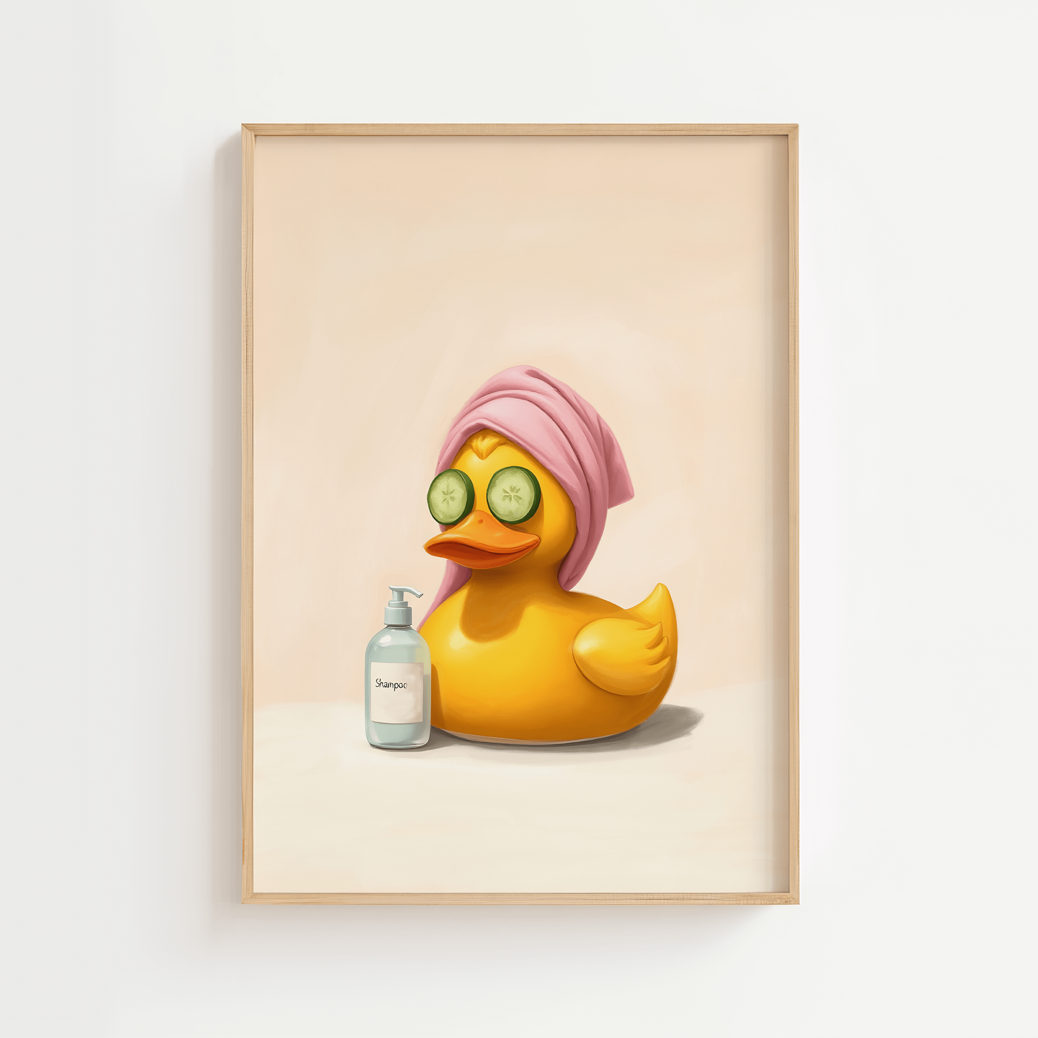 Add a smile to your morning routine with this charming poster of a bath duck in true spa style – with cucumbers for eyes, a pink towel and a bottle of shampoo next to it. A humorous and colorful choice for your bathroom or as a fun gift idea. The poster fits perfectly into both minimalist and playful home decor and is available in several sizes.