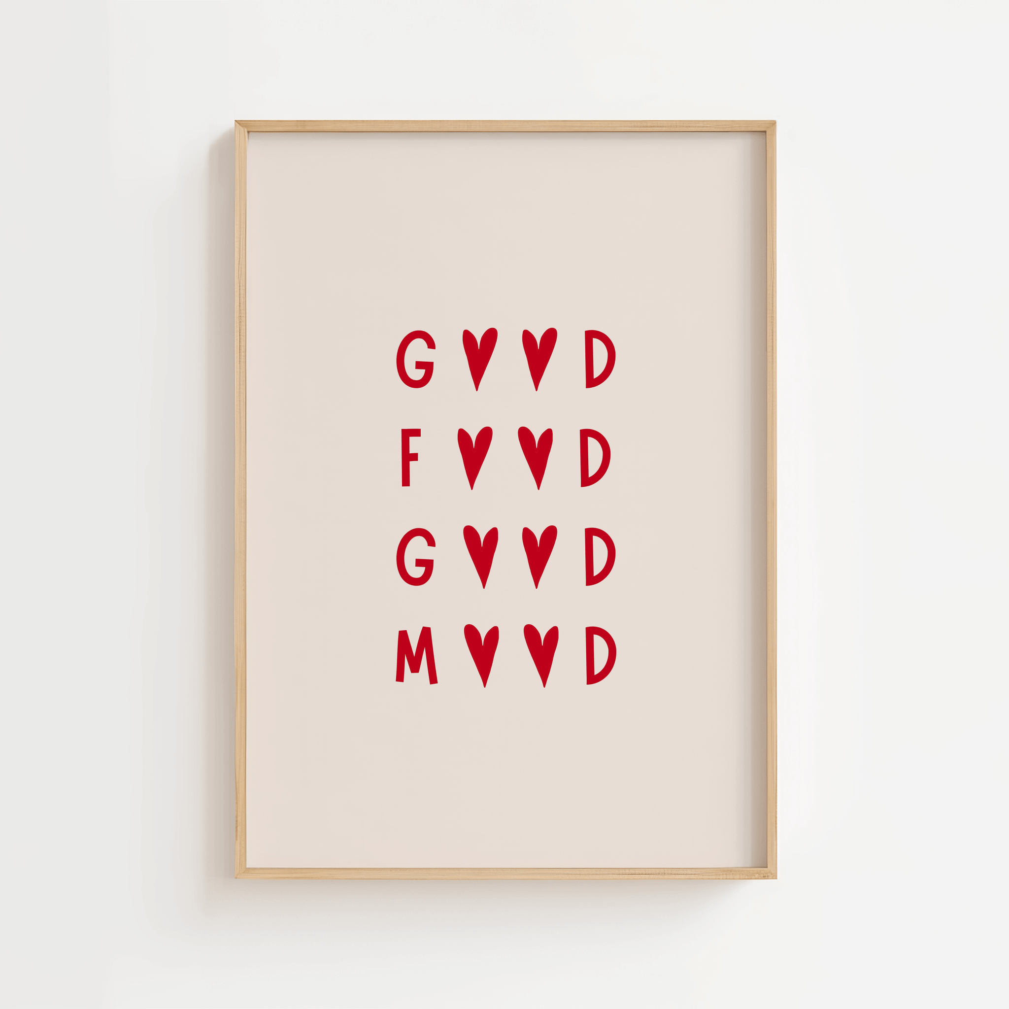 This Good Food Good Mood poster is a simple and stylish kitchen poster with a fun message. The text is printed in bright red letters with little hearts that spread both humor and coziness in the home. The poster fits perfectly in the kitchen, dining room or as a gift for food lovers.