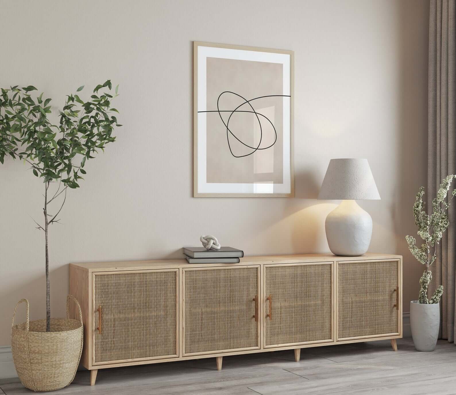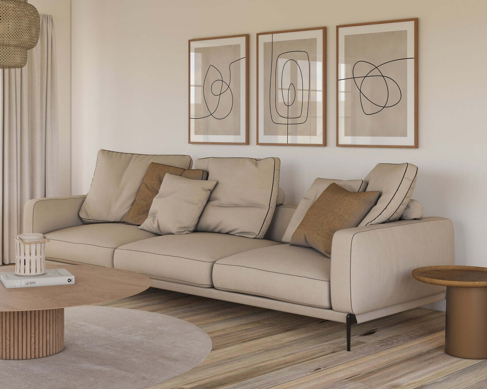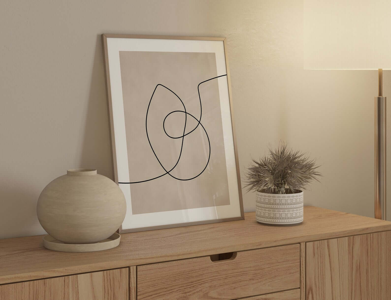 De enkle linjer giver billedvæggen et grafisk og eksklusivt look, samtidig med at de neutrale farver gør den nem at integrere i mange typer indretning. Billedvæggen tilfører karakter uden at virke tung – perfekt til dig, der ønsker moderne kunst med ro og kant.