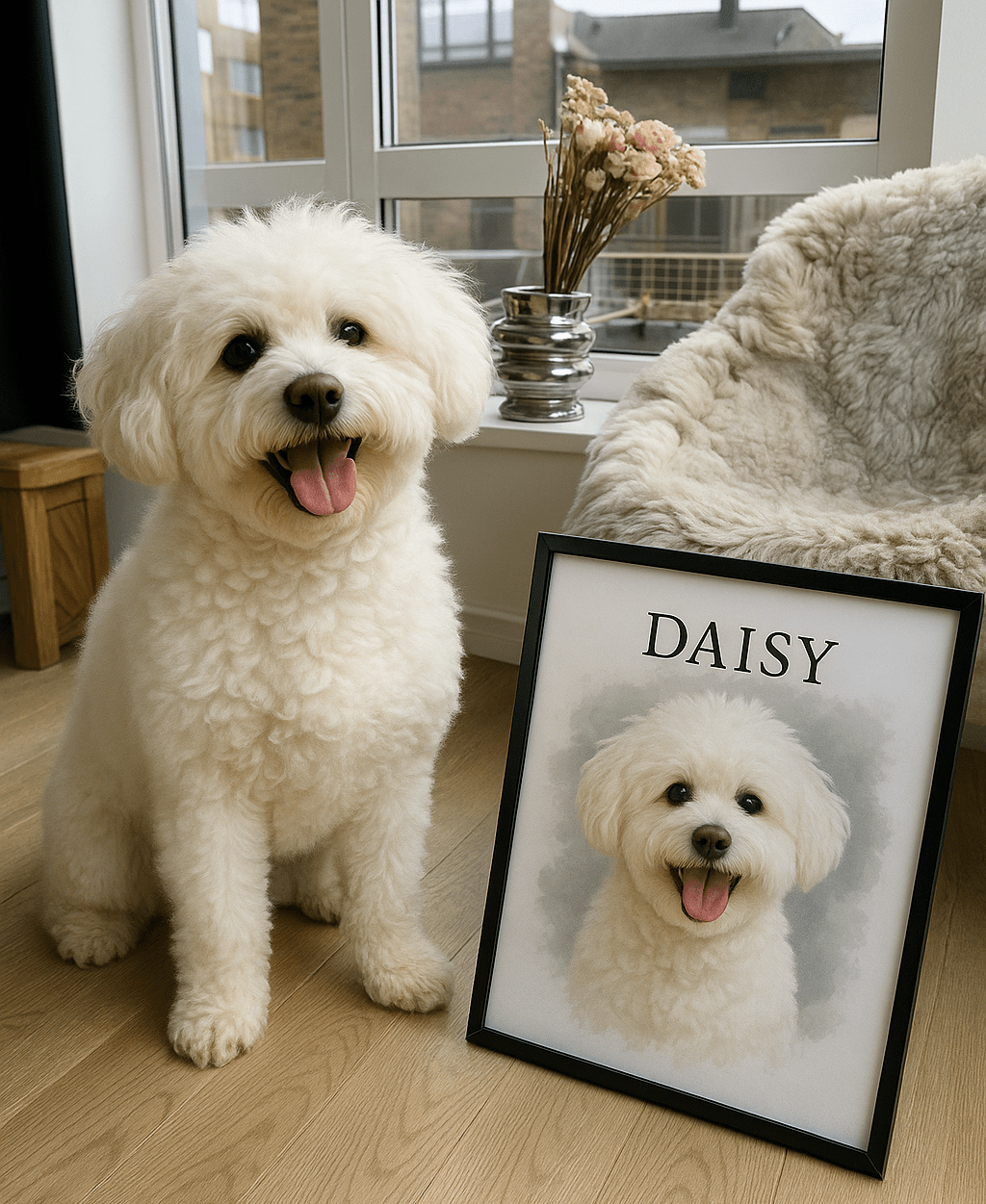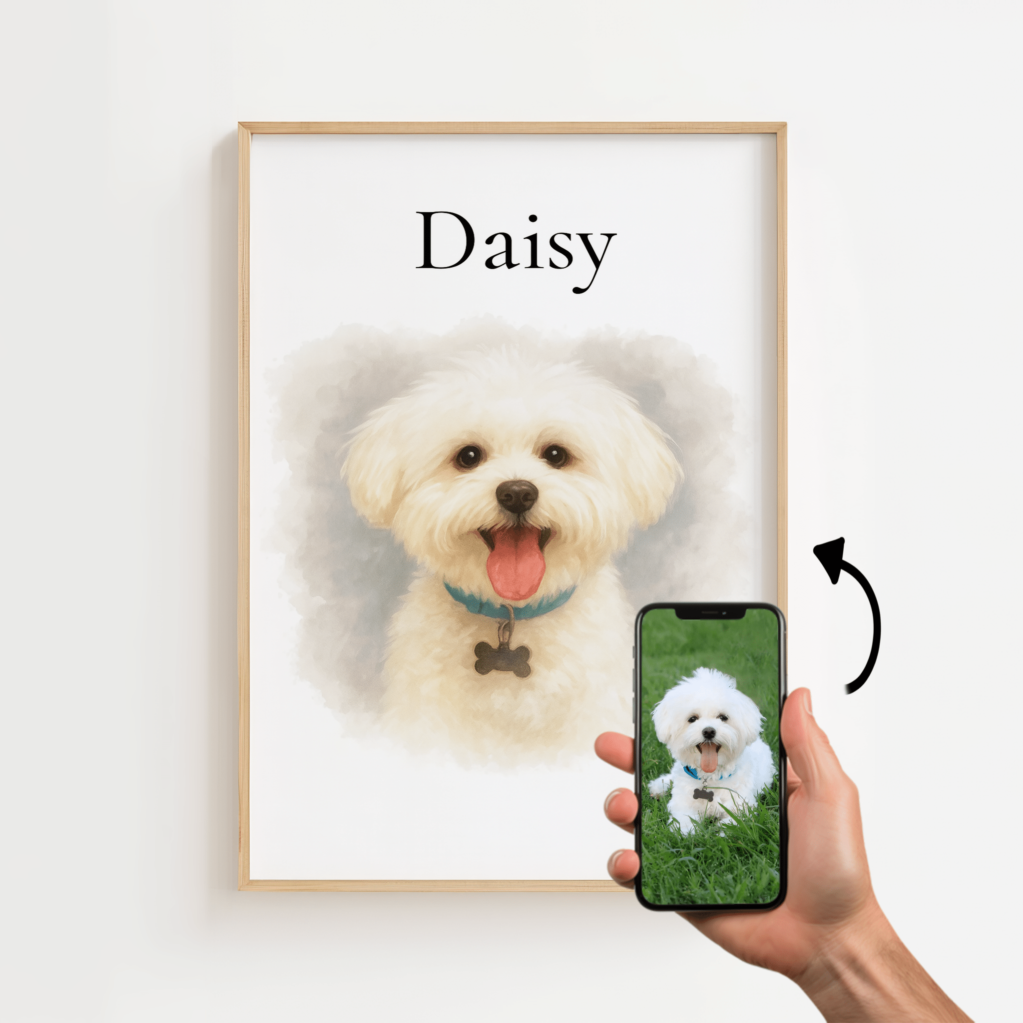 Create your own dog portrait poster – the perfect way to immortalize your four-legged friend! Upload a picture of your dog and have it transformed into a beautiful and personal poster with a minimalist design and the name printed below the motif. Choose from different sizes and frames, and make your personal dog portrait a unique part of your home decor.