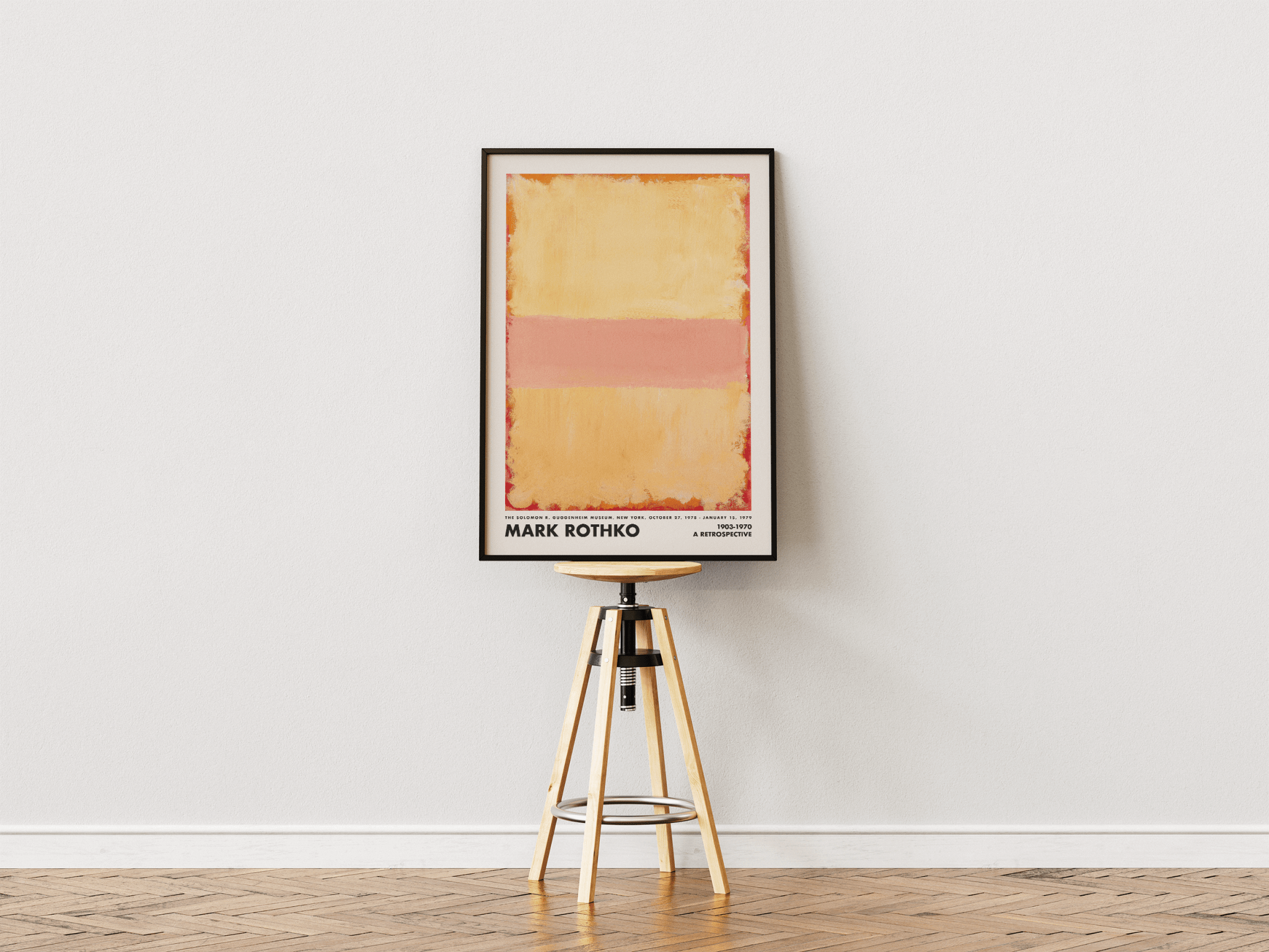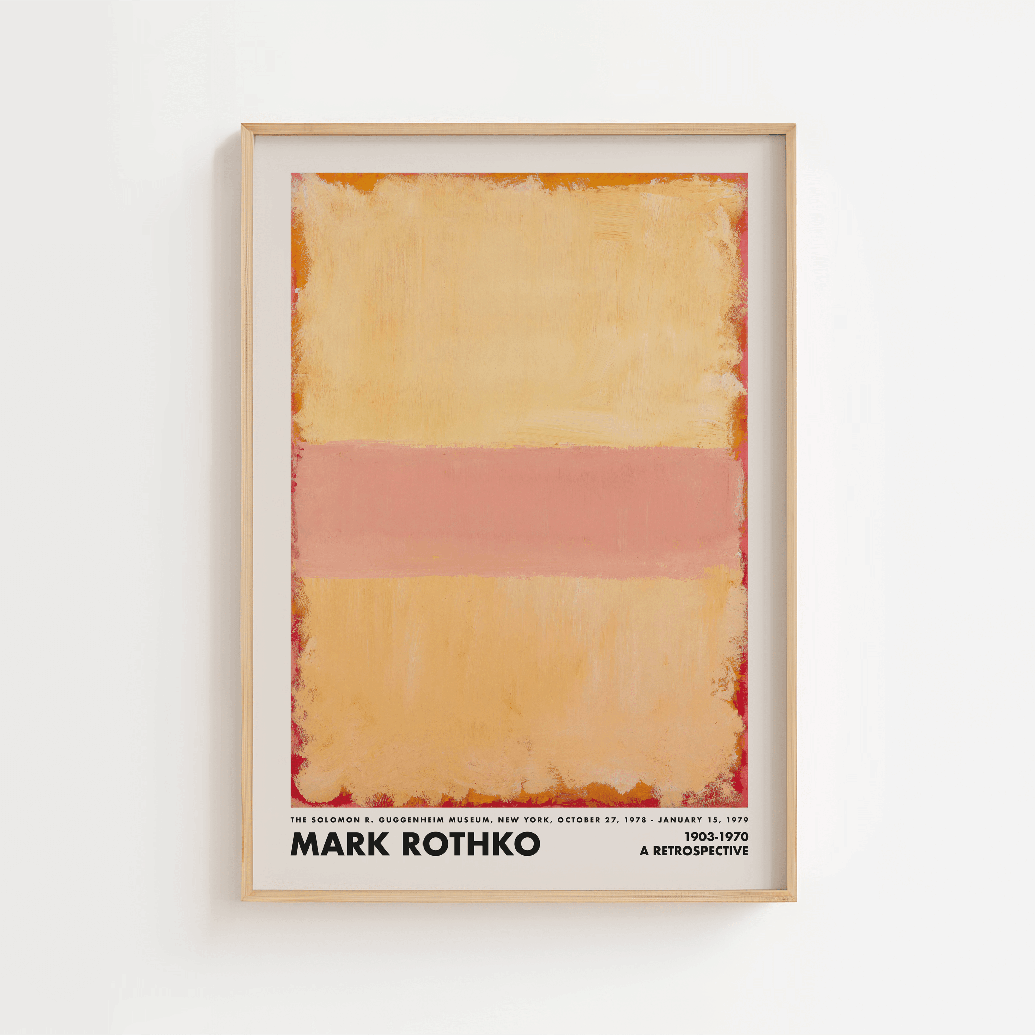 Skab en rolig, varm og harmonisk stemning i hjemmet med No.308 – Mark Rothko Plakat. Motivet består af bløde gule farvefelter kombineret med et stort rosa midterfelt og subtile rød-orange kanter, som giver helheden et let, kunstnerisk udtryk. De diffuse overgange og bløde penselstrøg gør plakaten ideel til moderne, skandinavisk indretning.