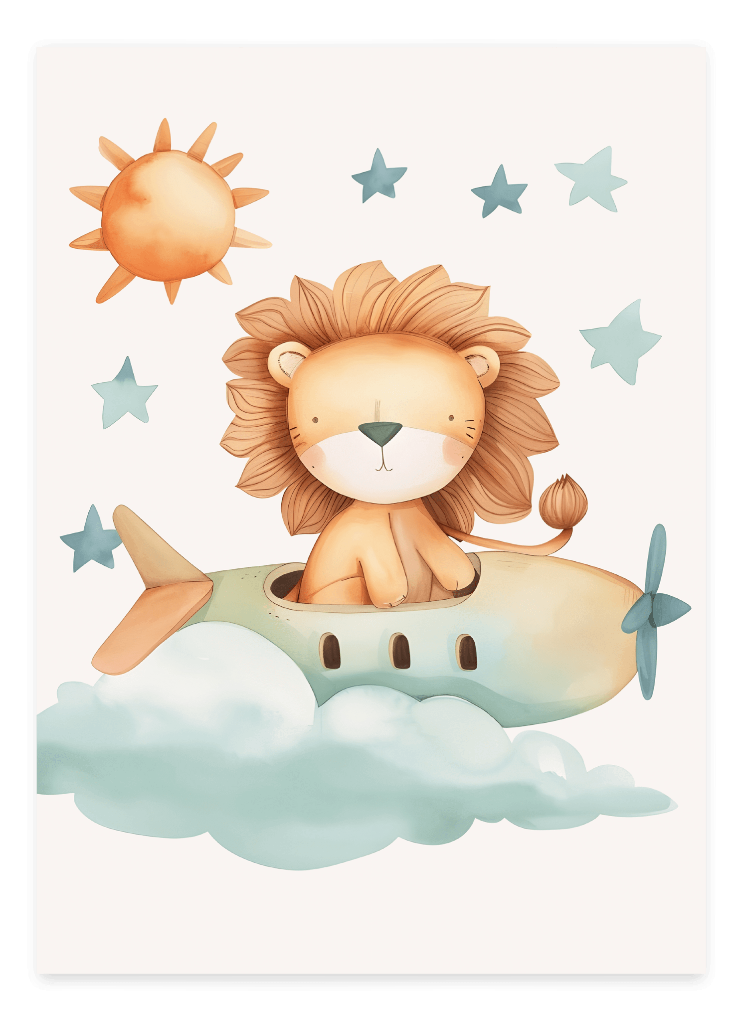 Das Poster schafft eine verspielte und inspirierende Atmosphäre im Kinderzimmer. Gedruckt auf hochwertigem Material mit leuchtenden Farben und wunderschönen Details, verleiht das Poster „Löwe im grünen Flugzeug“ dem Raum eine einzigartige und fröhliche Note.
