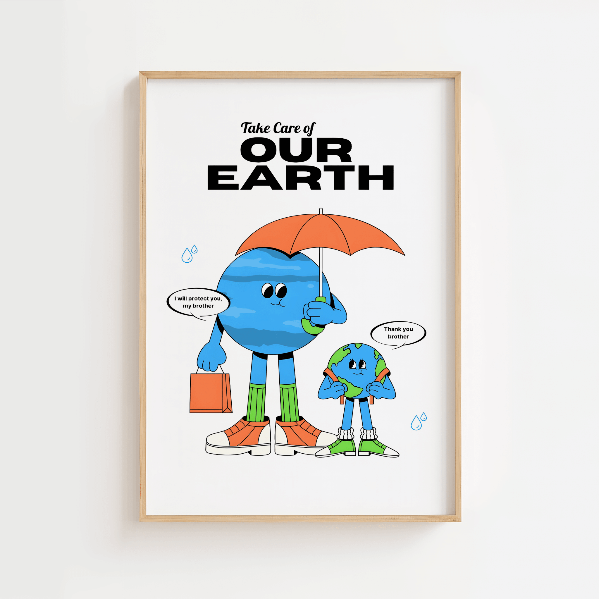 Take Care of Our Earth Plakat er en humoristisk og hjertevarm illustration med et vigtigt budskab: Pas på vores planet 🌍