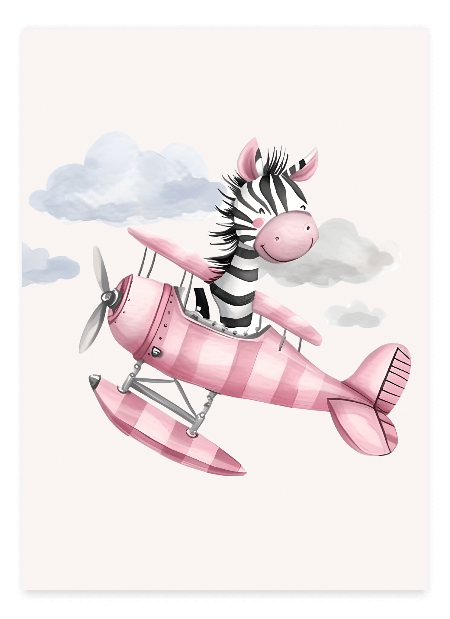 Lad fantasien flyve med Zebra i et Pink Fly - Børneplakat! Denne sjove og eventyrlige børneplakat viser en sød zebra, der svæver gennem himlen i sit lyserøde fly. Perfekt til børn, der elsker dyr, flyvemaskiner og fantasifulde motiver.