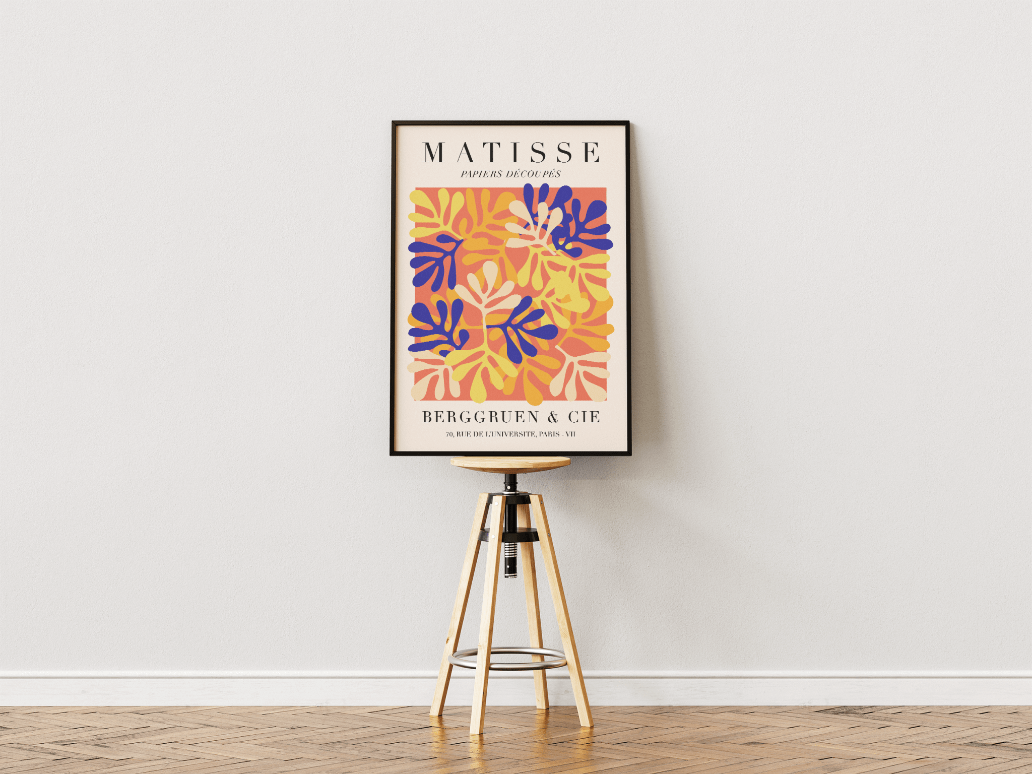 Plakaten er inspireret af Matisses berømte Papiers Découpés, hvor farverige, organiske former skaber et levende og harmonisk udtryk. De gule, blå, orange og cremefarvede blade former et varmt og dynamisk motiv, der passer perfekt ind i både skandinavisk og kreativ indretning.