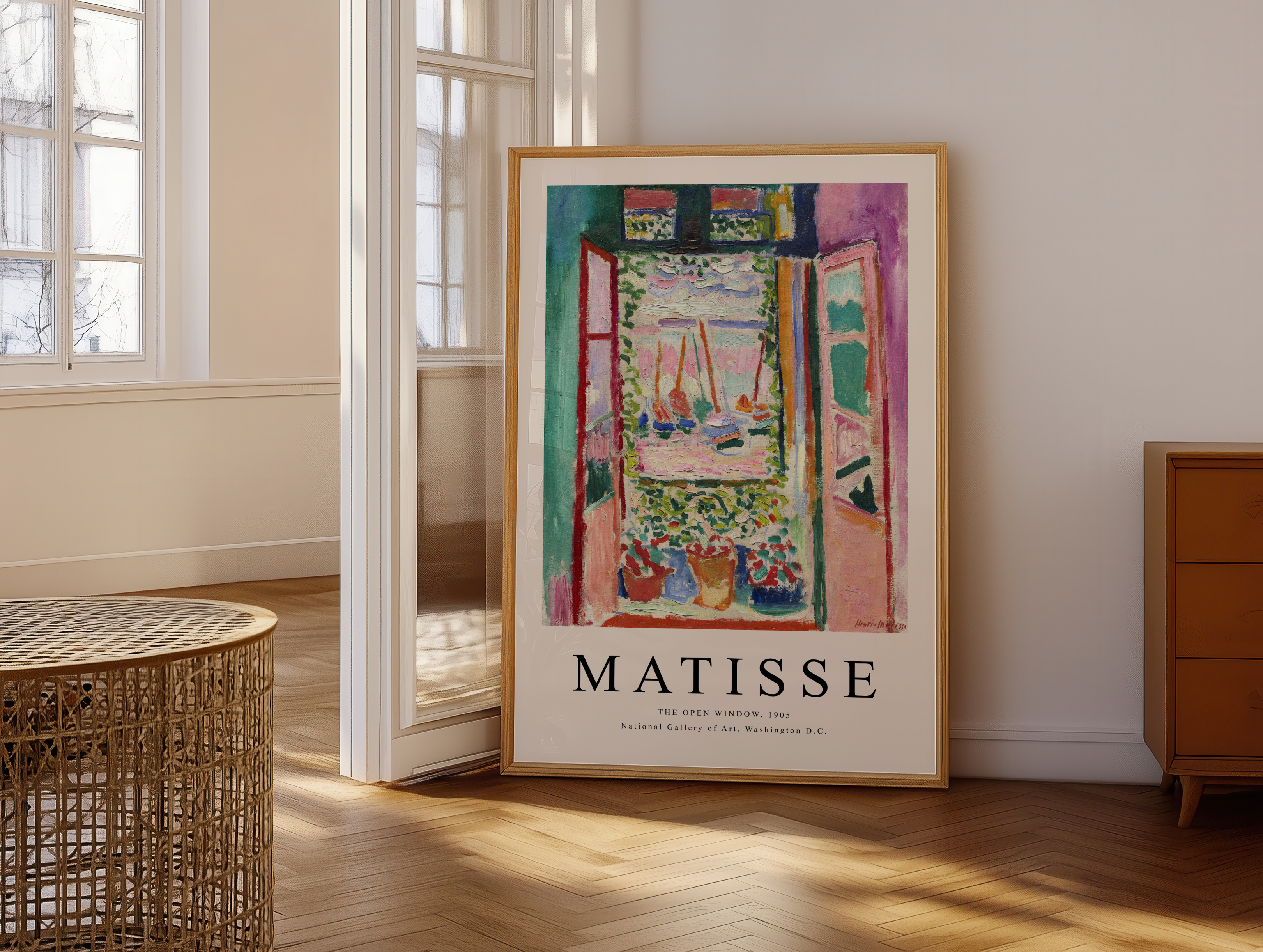 The Open Window – Matisse Plakat er et af Henri Matisses mest ikoniske værker fra 1905 og et hovedværk inden for fauvismen. Motivet viser et åbent vindue ud mod havnen i Collioure, hvor blomster, både og farverige facader smelter sammen i en levende og energisk komposition.