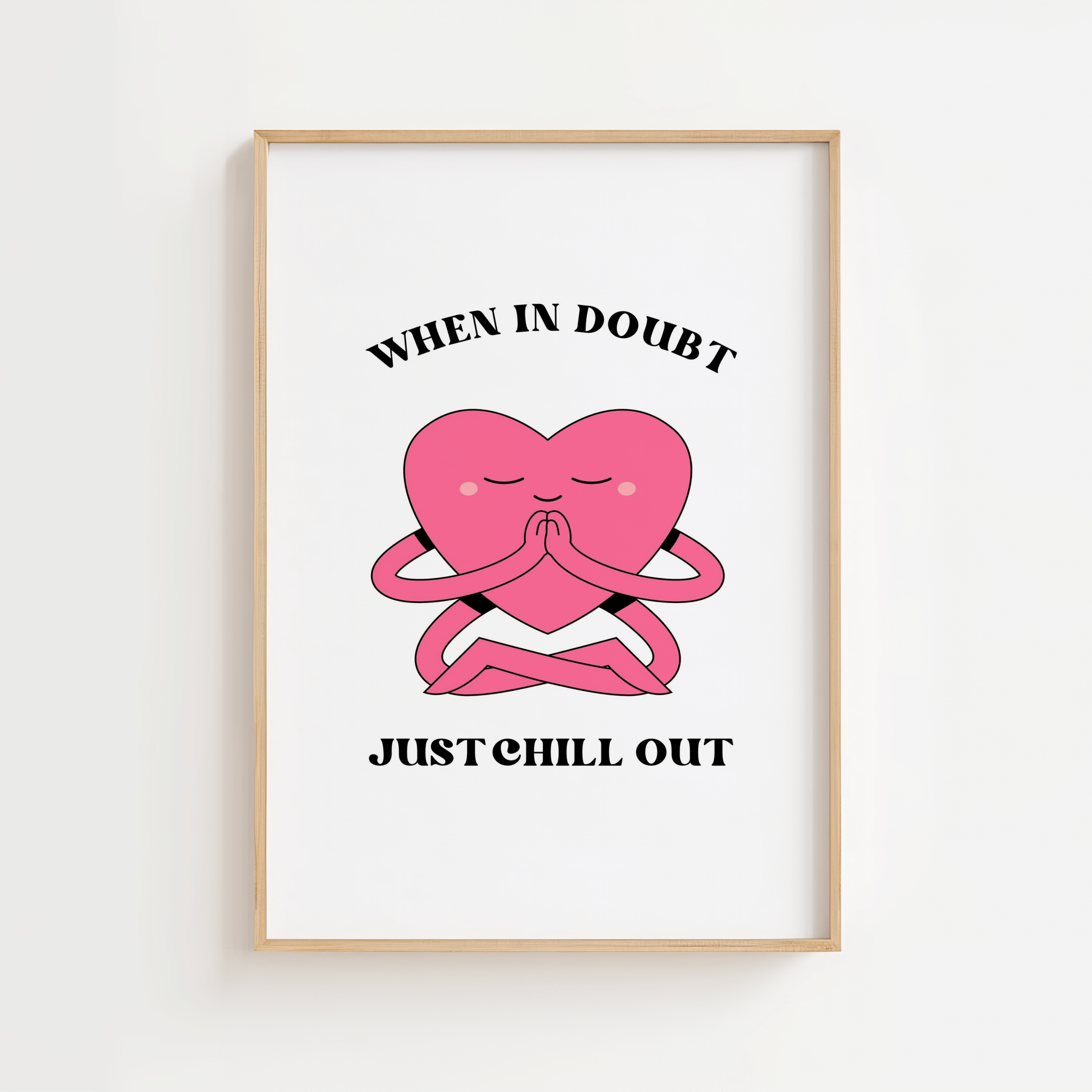 When in Doubt – Just Chill Out Plakat er en farverig og livsglad plakat med et simpelt men stærkt budskab: Slap af og tag tingene som de kommer. Det legende design og de klare farver gør plakaten oplagt til rum, hvor du vil skabe ro, balance og smil.