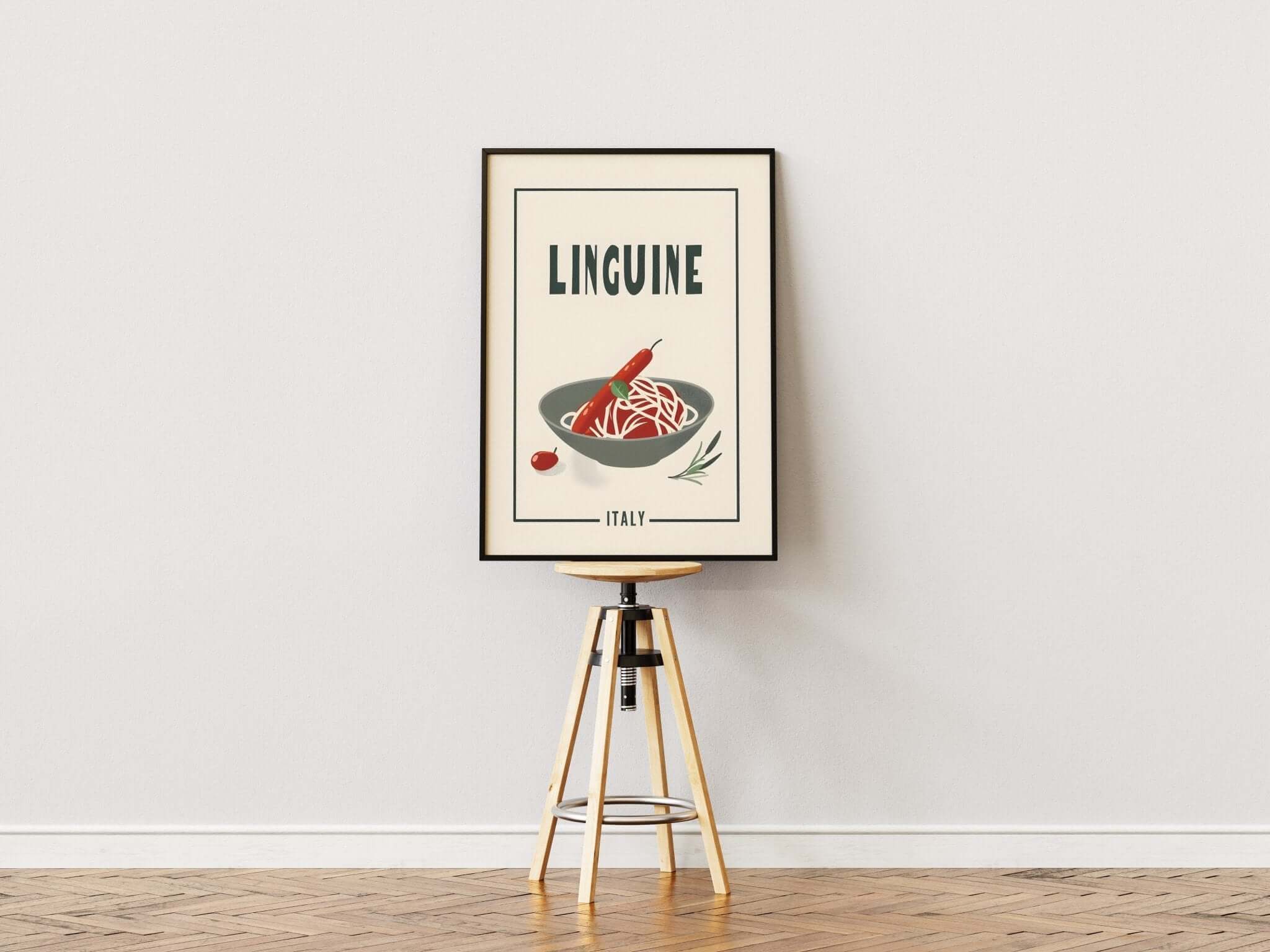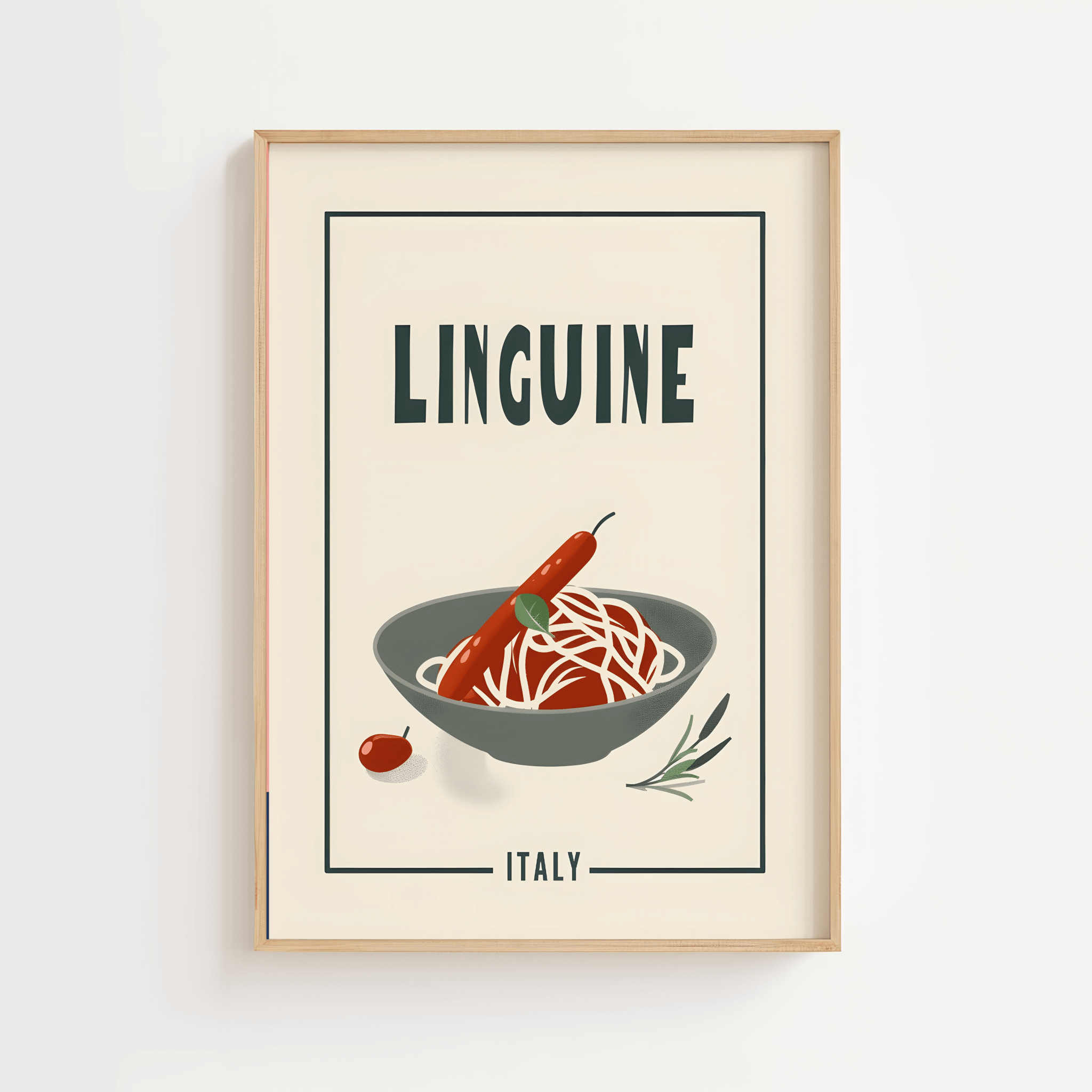 Bring smagen af Italien ind i dit hjem med denne Linguine plakat. Den viser en skål klassisk linguine med tomatsauce, chili og friske urter i et stilrent, retro-inspireret design. Perfekt til at skabe stemning i køkkenet eller spisestuen og et oplagt valg til enhver pastaelsker.