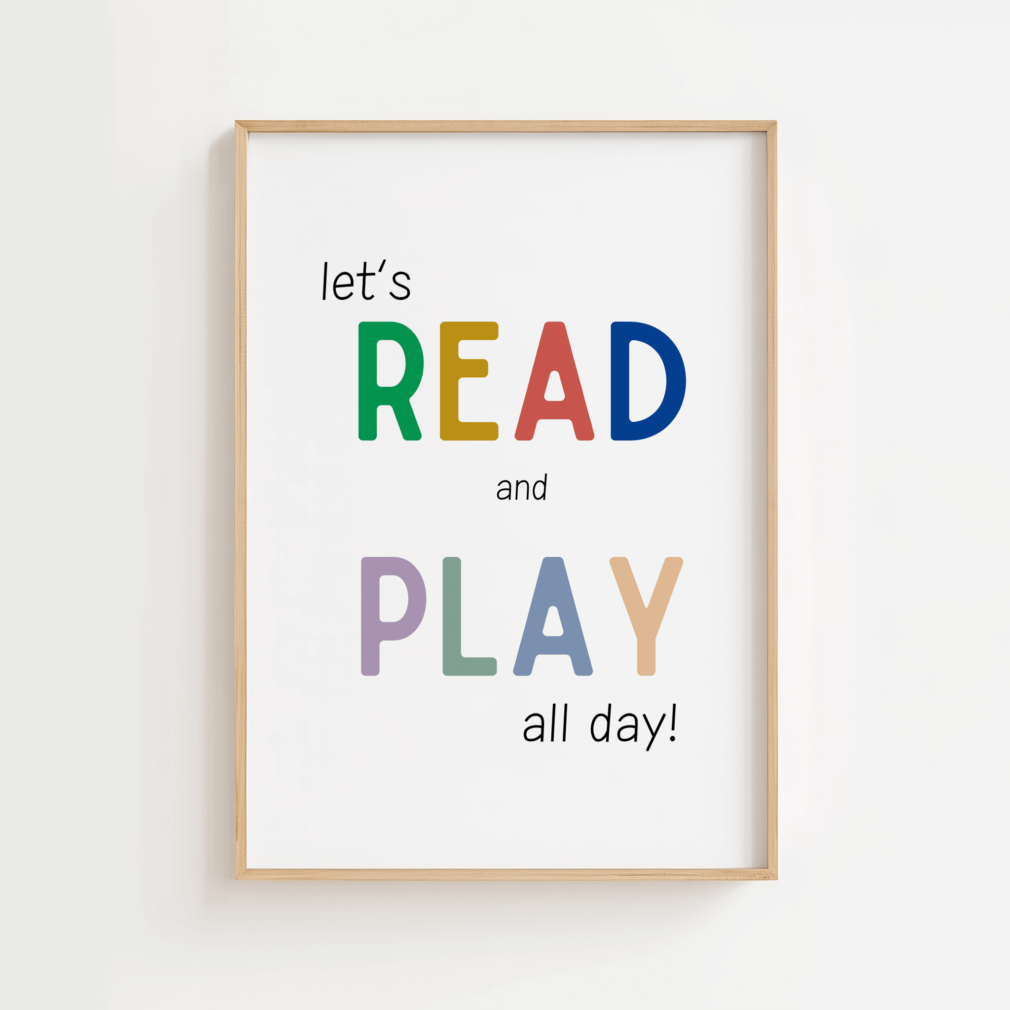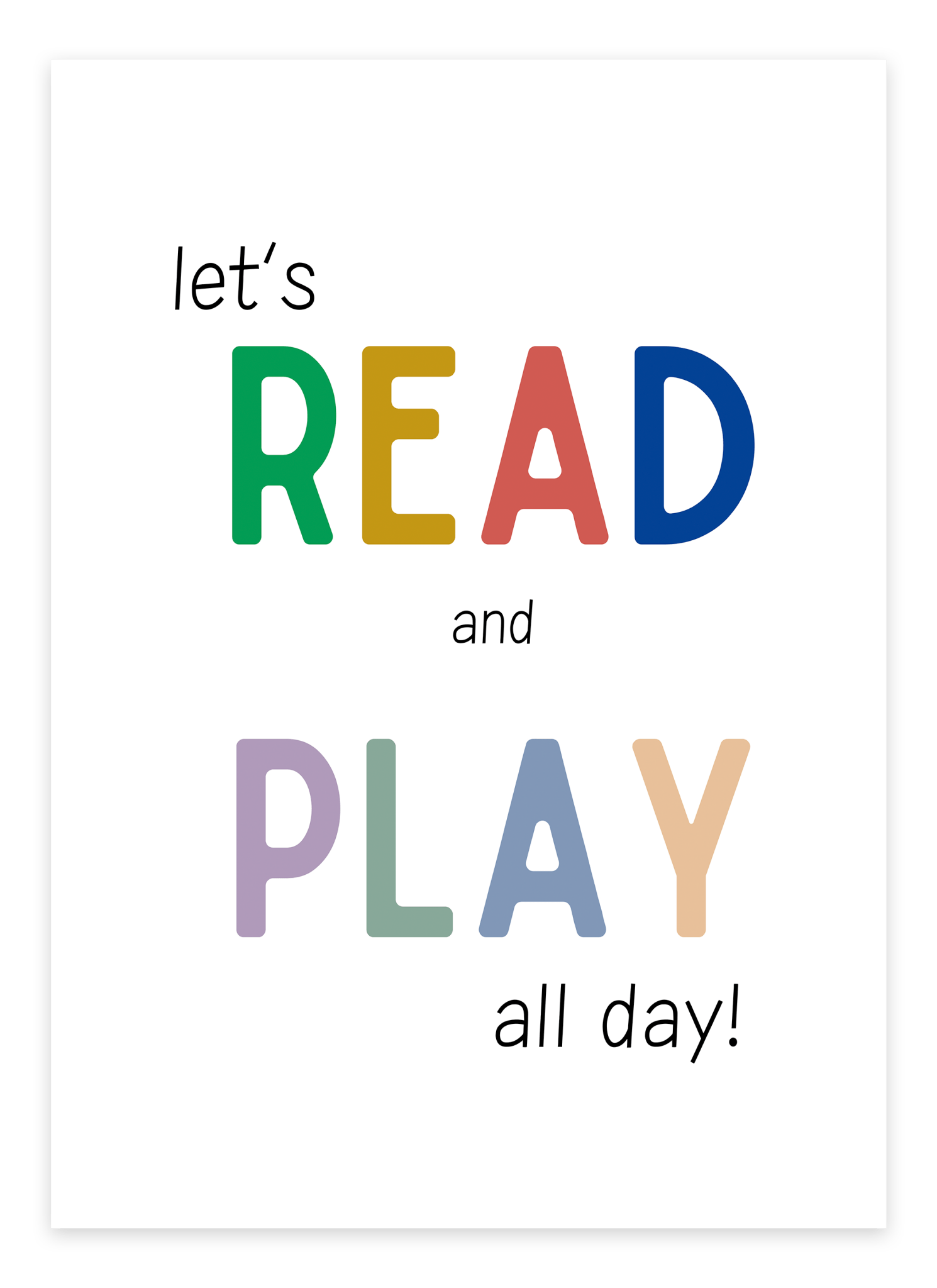 Gestalten Sie ein inspirierendes Kinderzimmer mit dem Poster „Let's Read and Play All Day“. Perfekt, um das Lesen und Spielen in einer farbenfrohen und einladenden Umgebung zu fördern