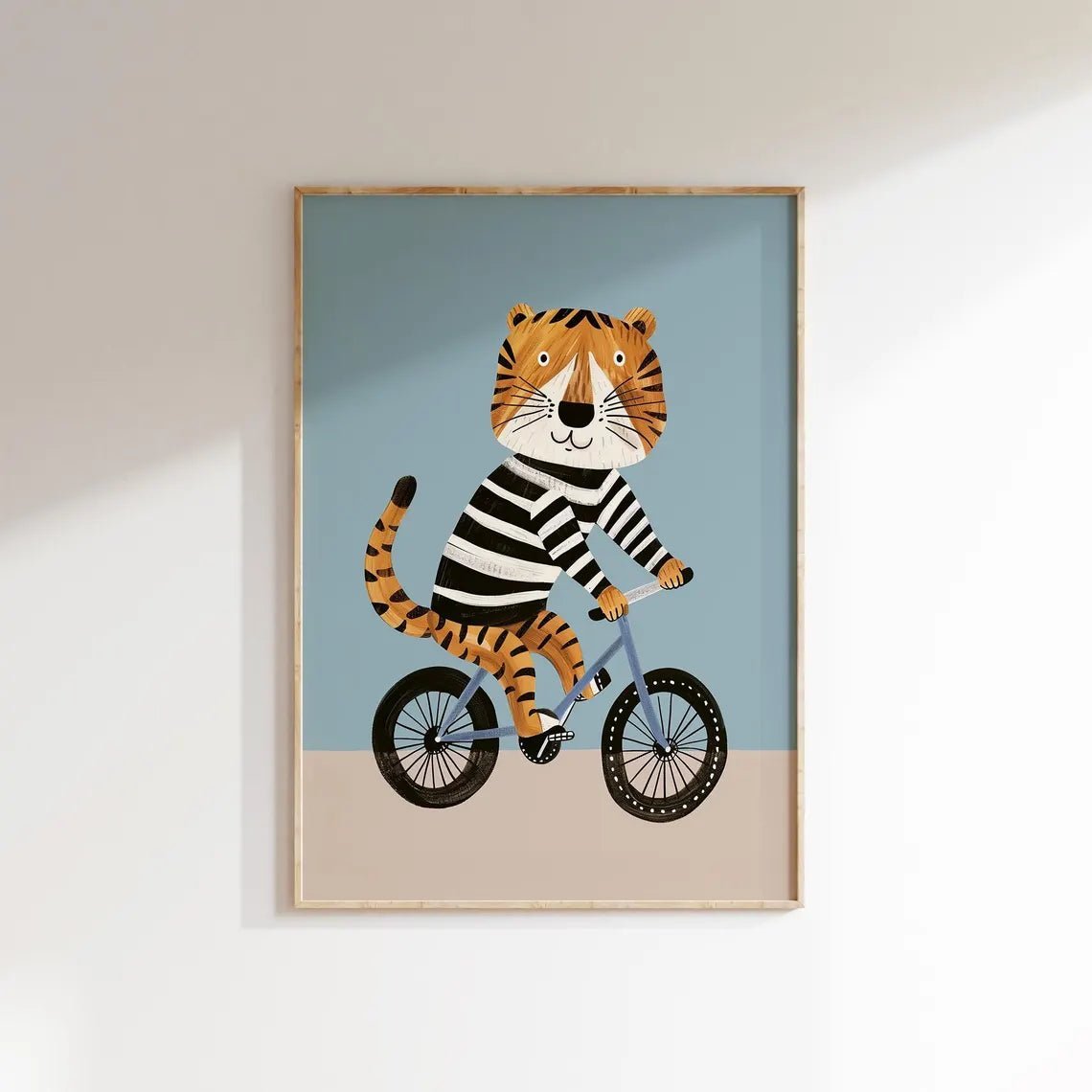 Tiger auf dem Fahrrad Das Kinderposter ist ein farbenfrohes und energiegeladenes Poster, das einen Tiger in Höchstgeschwindigkeit auf einem Fahrrad zeigt. Es verleiht dem Kinderzimmer eine verspielte und abenteuerliche Atmosphäre und ist perfekt für Kinder, die sowohl Tiere als auch Radfahren lieben. Mit seinem lebendigen Design und dem humorvollen Ausdruck ist dieses Poster eine tolle Geschenkidee für junge Abenteurer, die von lustigen Erlebnissen und Geschwindigkeit träumen. Ob als Teil eines Sport- oder Tiermotivs, dieses Poster wird eine inspirierende und energiegeladene Atmosphäre im Raum schaffen.