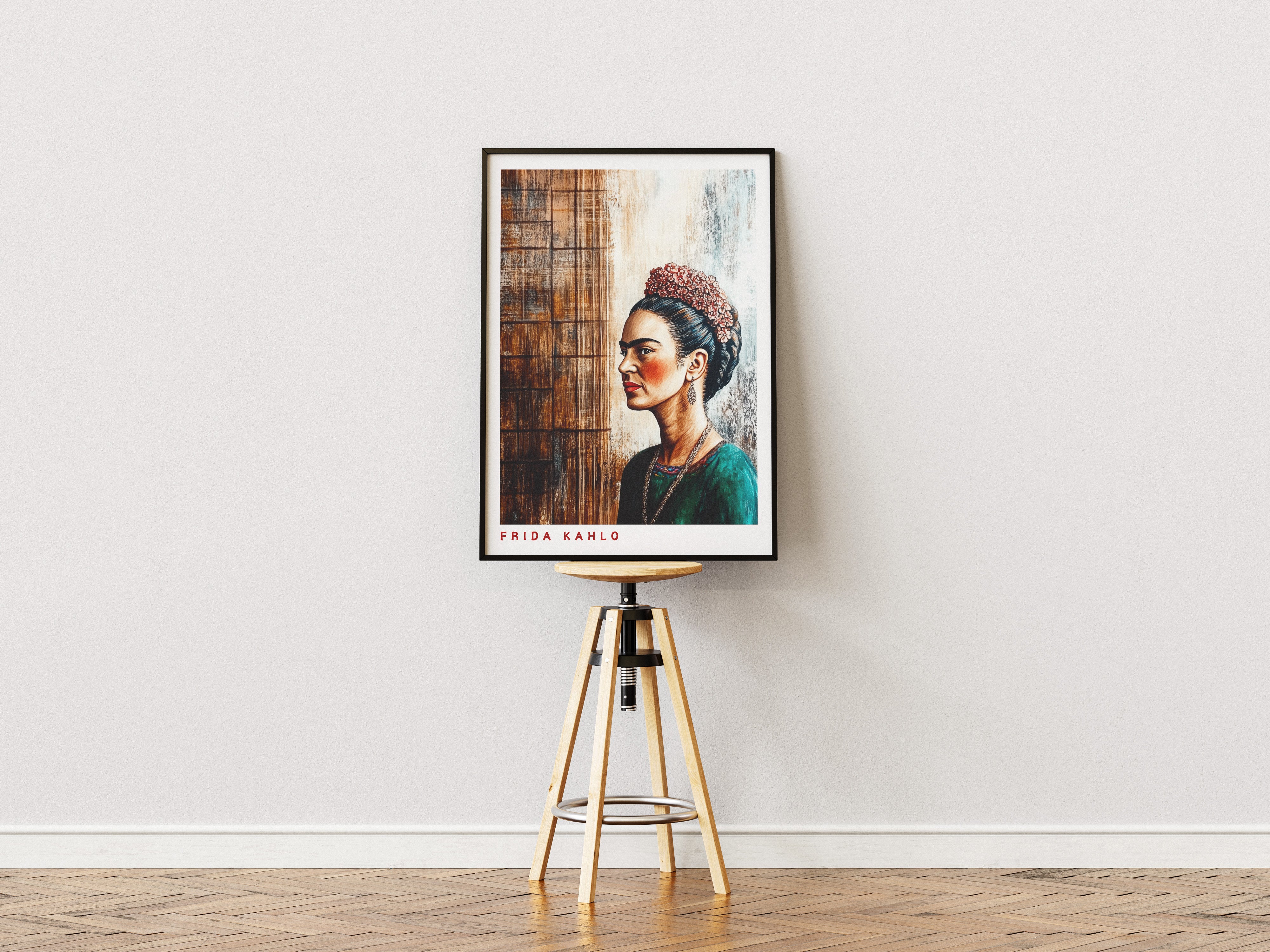 Trævæg Profil – Frida Kahlo Plakat viser den berømte kunstner i et markant sideportræt, iført grøn kjole og røde blomster i håret. Den rustikke træbaggrund giver varme og kontrast til de klare farver, hvilket gør plakaten til et iøjnefaldende element i din boligindretning. Trykt på kvalitetspapir for skarpe detaljer og lang holdbarhed.
