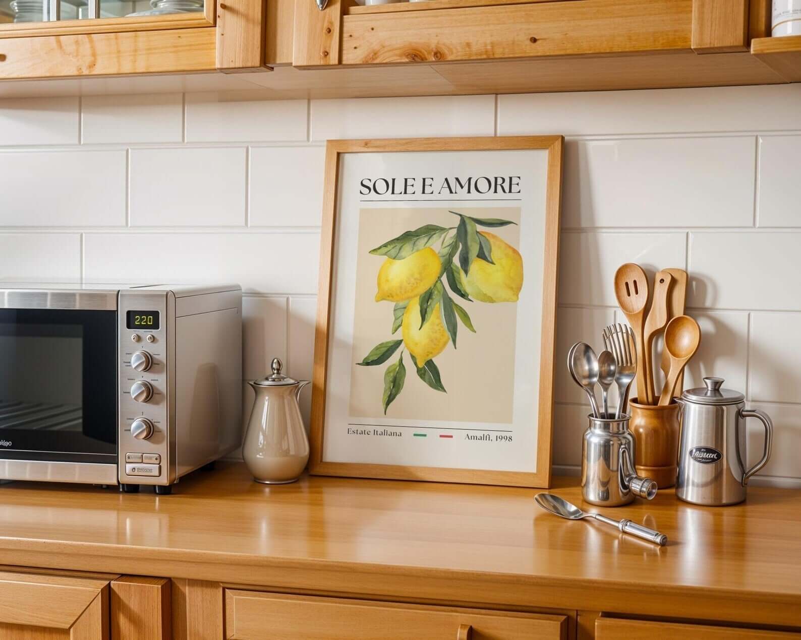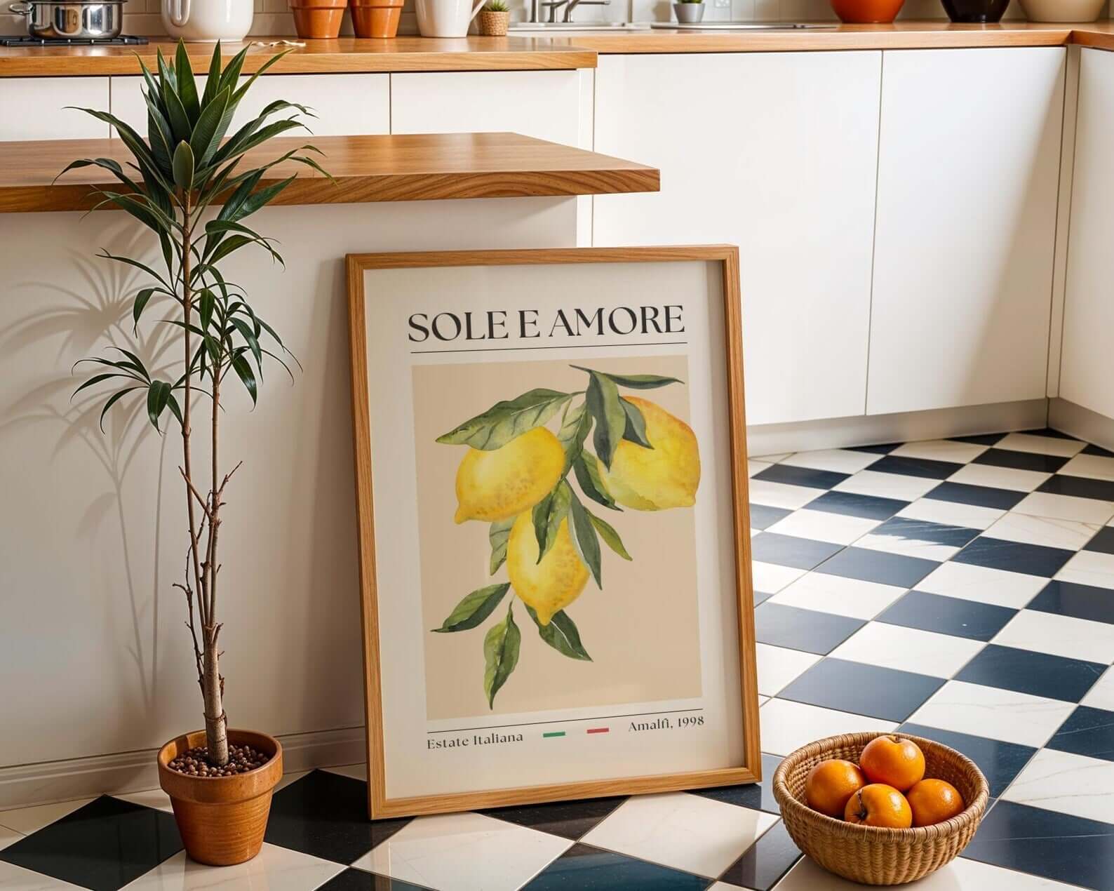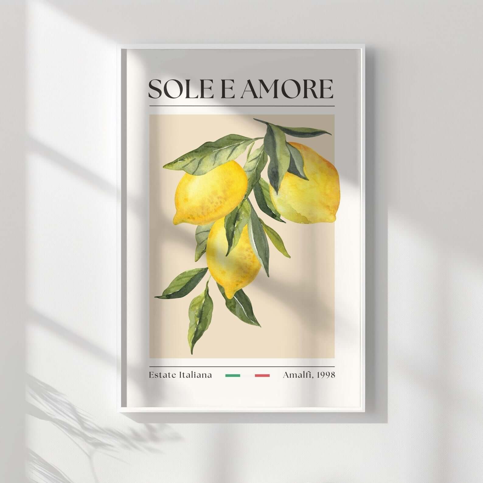 Sole e Amore – Italiensk Citronplakat bringer følelsen af sol, sommer og kærlighed fra Amalfikysten direkte ind i dit hjem. Med sit elegante vintage-design, teksten Sole e Amore og håndmalede citroner, skaber denne plakat en varm og æstetisk atmosfære.