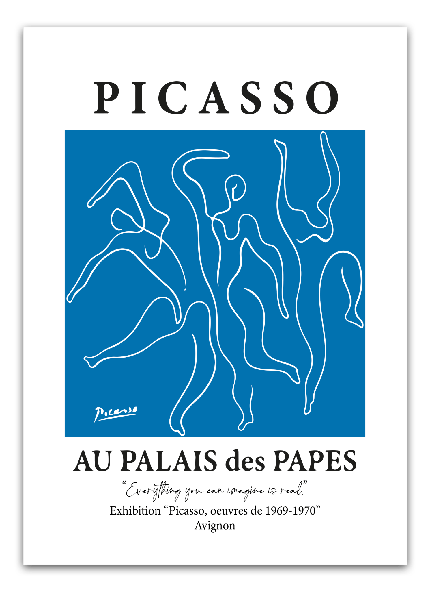 Das Poster „Blue Au Palais De“ besticht durch seine elegante und künstlerische Gestaltung, die typografische Ausdruckskraft und französisches Flair vereint. Die blaue Grafik und die klassische Schriftart verleihen dem Poster einen stilvollen und anspruchsvollen Look, inspiriert von Kunstplakaten des Paris des 20. Jahrhunderts und der Matisse-Ära.