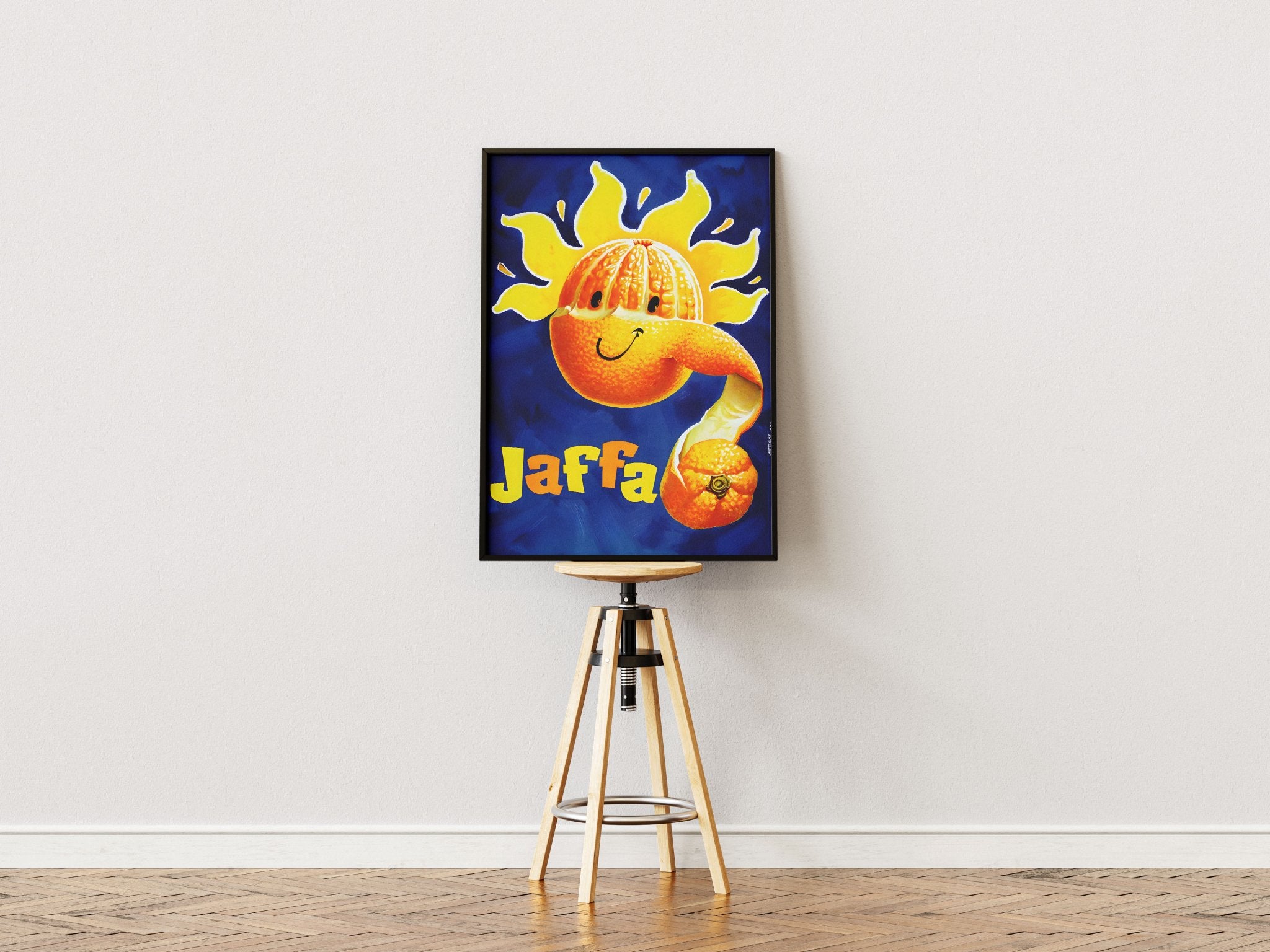 Bring farve og humor ind i dit hjem med denne sjove og livlige vintage plakat med teksten Jaffa. Motivet viser en smilende appelsin med skræl og citruspresser som hoved – en kreativ og legende illustration, der stammer fra et klassisk reklameunivers. Med den dybe blå baggrund og den karakteristiske typografi i gult, bliver denne plakat et iøjnefaldende element i ethvert rum.