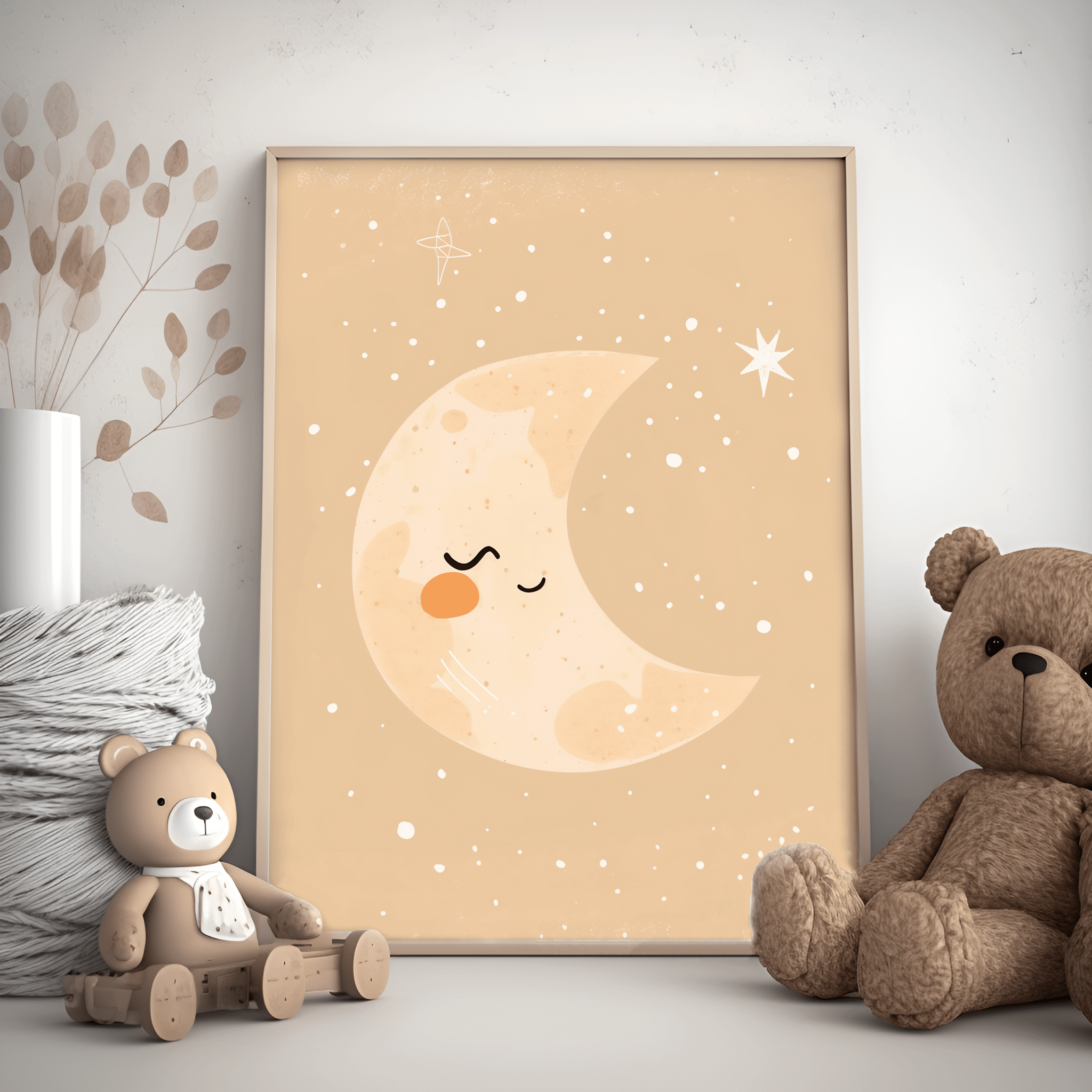 Lad dit barn falde trygt i søvn med Træt Måne - Børneplakat. Denne børneplakat viser en søvnig og fredfyldt måne, perfekt til at skabe en beroligende stemning ved sengetid. De bløde farver og det rolige design gør den ideel til en hyggelig og tryg atmosfære.