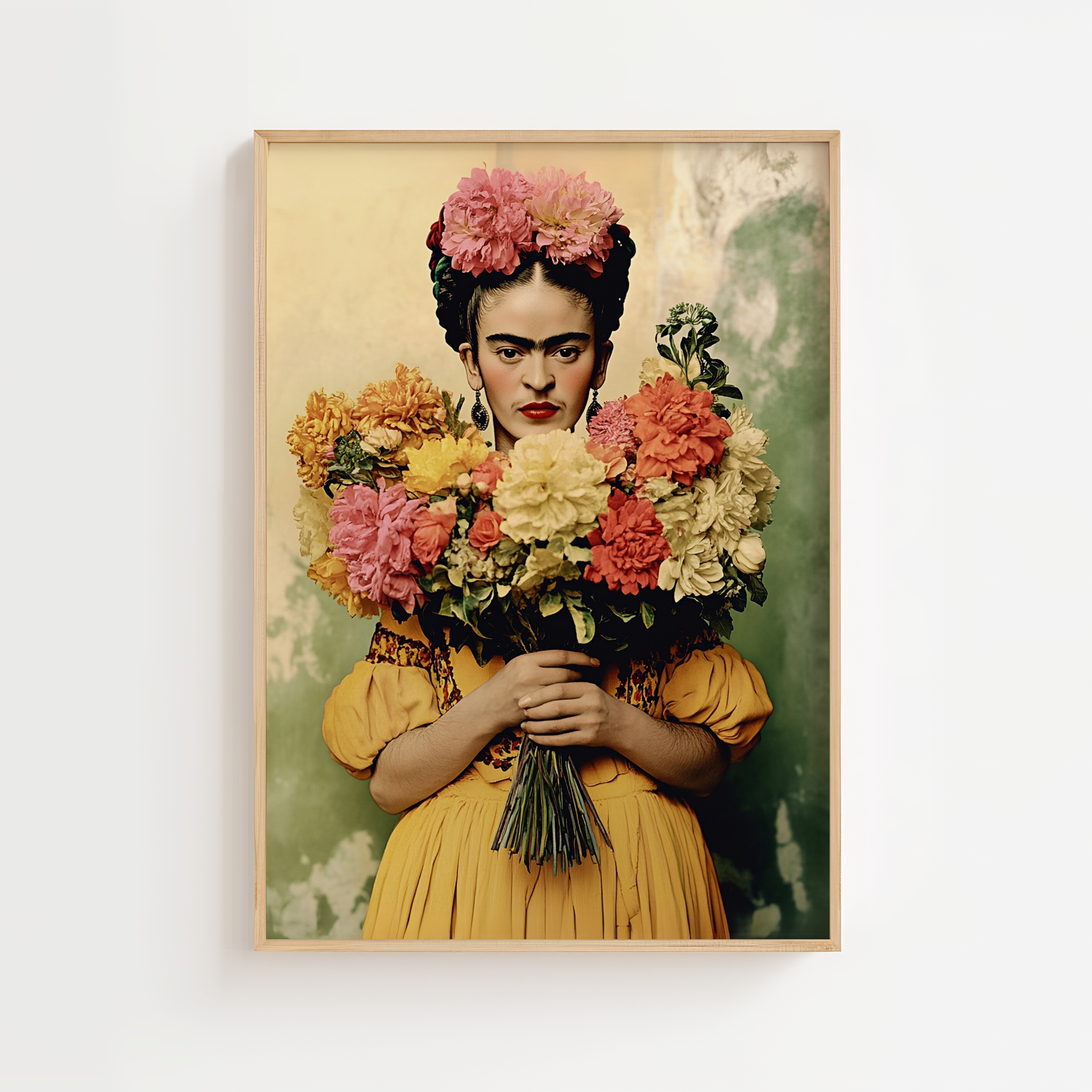 Gul Kjole & Store Blomster – Frida Kahlo Plakat fanger Frida Kahlos unikke stil i et farverigt og stemningsfuldt portræt. Den ikoniske kunstner er klædt i en smuk gul kjole og holder en stor buket blomster i varme farver, der fremhæver hendes styrke og personlighed. En ideel kunstplakat til dig, der ønsker at bringe kultur, farver og historie ind i indretningen.