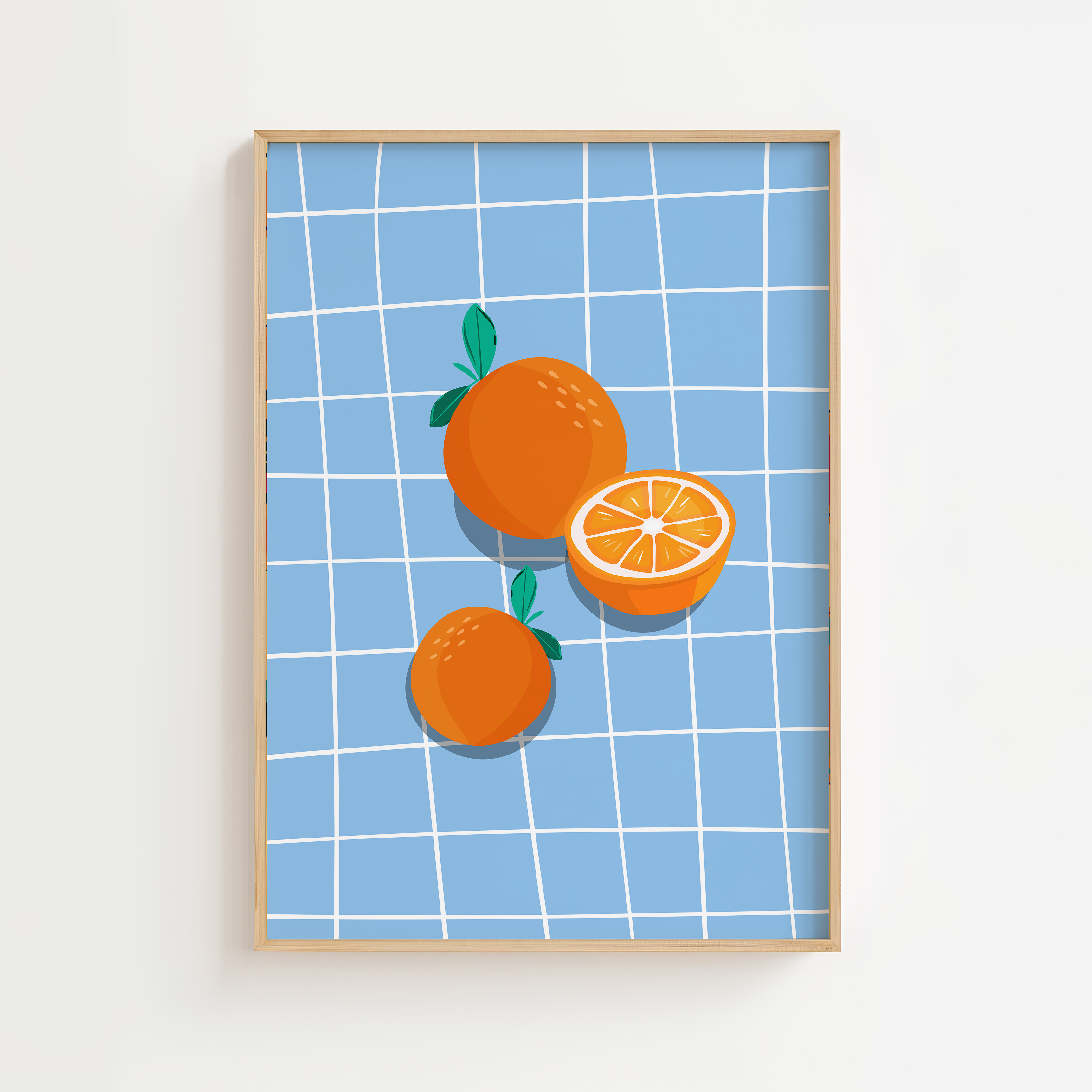 Bring friskhed og farve ind i hjemmet med Oranges on Blue Plakat. Motivet viser tre saftige appelsiner – heraf én halveret – på en klar blå baggrund med hvide tern. Det enkle grafiske design skaber et moderne og legende udtryk, som passer perfekt til både køkken, stue eller en farverig billedvæg.