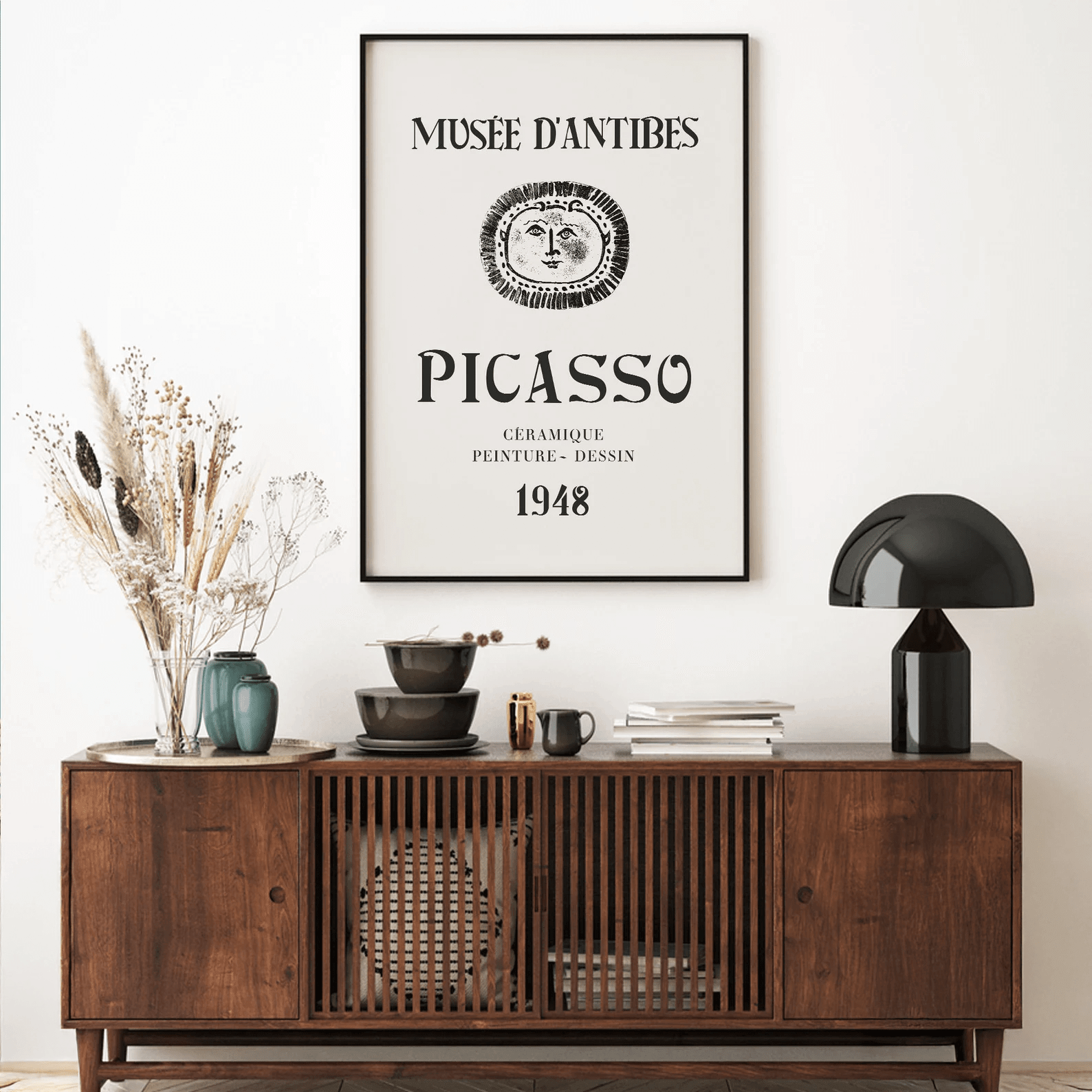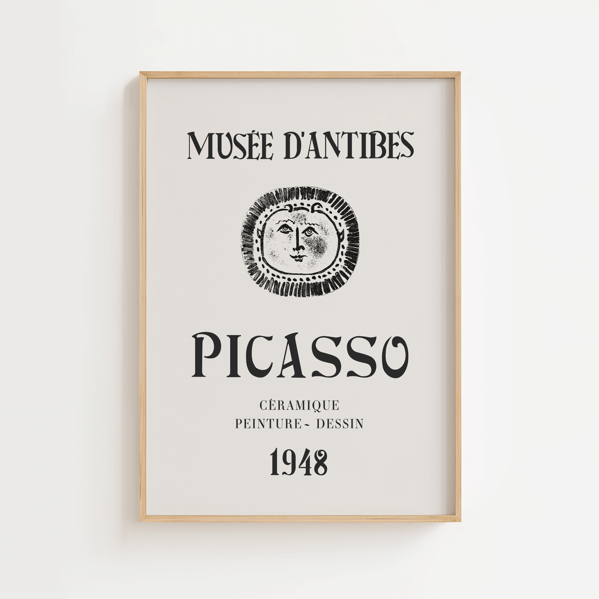Musée d’Antibes 1948 – Picasso Plakat er en grafisk og elegant kunstplakat med minimalistisk sort-hvidt design. Plakaten gengiver en original udstilling fra Musée d’Antibes i 1948 og prydes af en ikonisk sol-lignende keramikillustration og håndtegnet typografi.