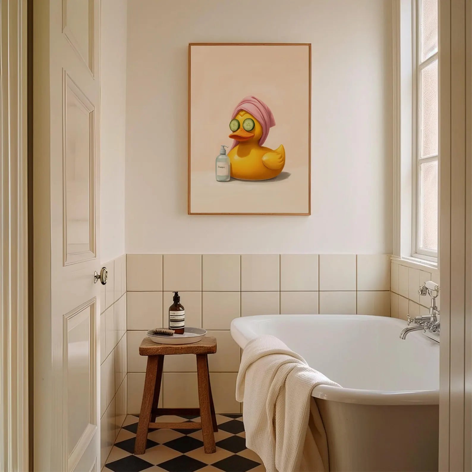 Tilføj et smil til morgenrutinen med denne charmerende plakat af en badeand i ægte spa-stil – med agurker på øjnene, pink håndklæde og en flaske shampoo ved siden af. Et humoristisk og farverigt valg til dit badeværelse eller som en sjov gaveidé. Plakaten passer perfekt ind i både minimalistisk og legende boligindretning og fås i flere størrelser.