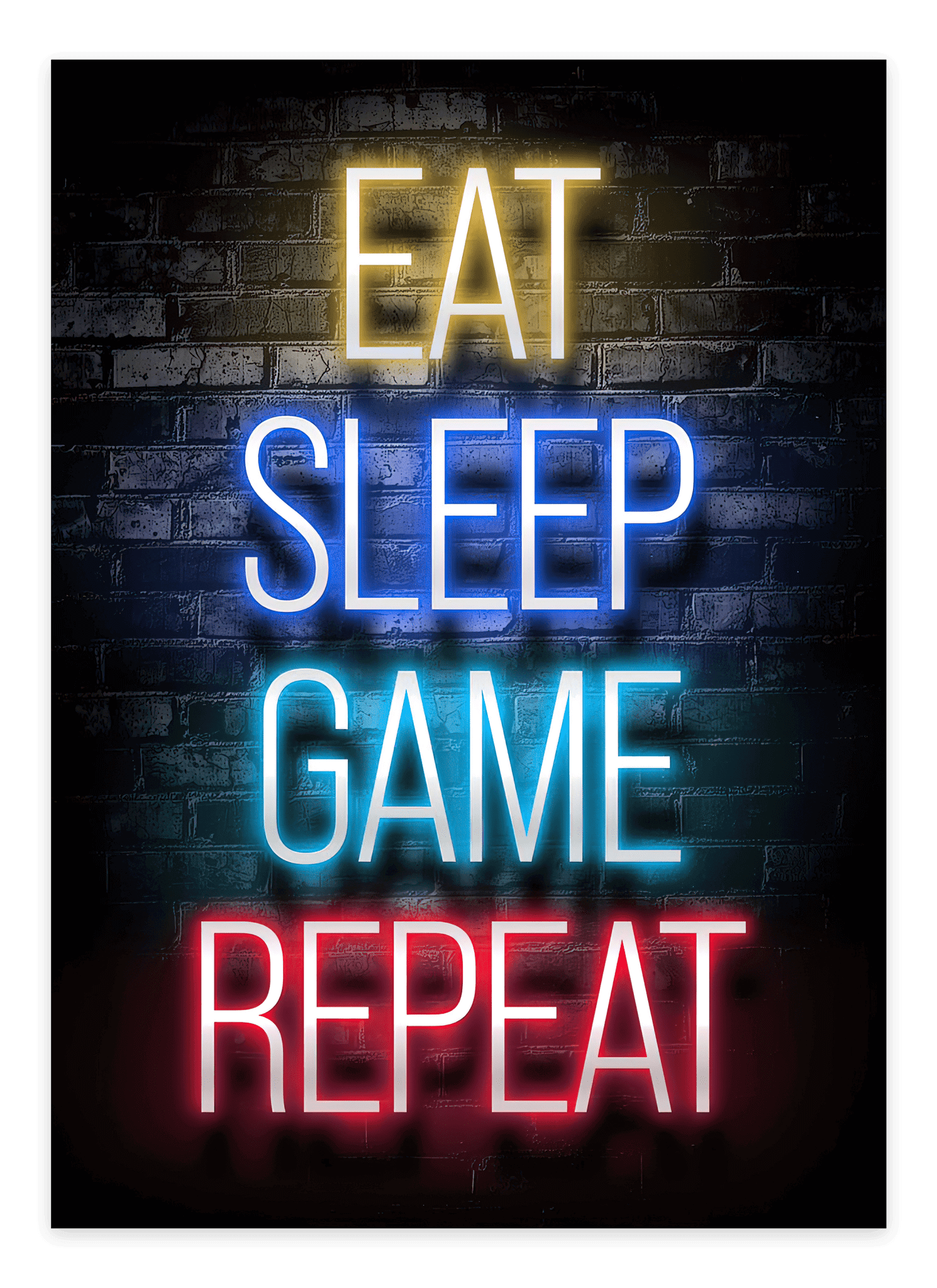 For en ægte gamer er der kun én rytme i livet: Eat, Sleep, Game, Repeat! Denne gamerplakat er en hyldest til gamerlivet og den perfekte vægdekoration til enhver gaming-hule. Med et stilrent design og et ikonisk gamer-motto passer den perfekt ind i ethvert setup.