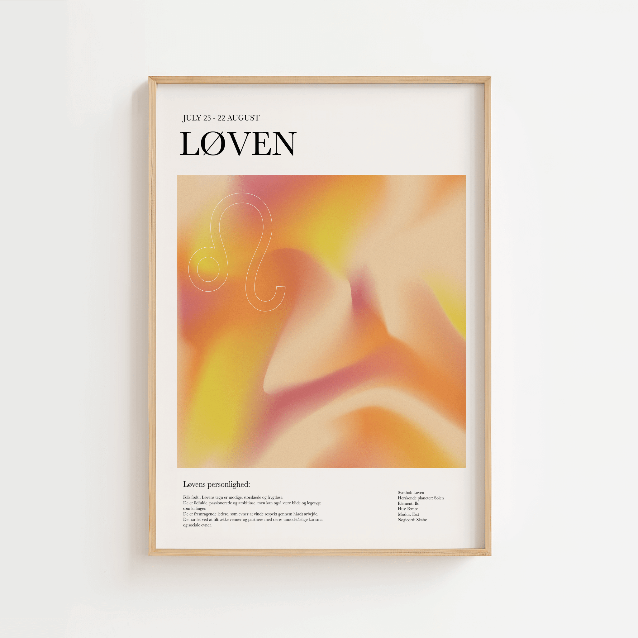 Står du under stjernetegnet løven? Så er denne farverige stjernetegns plakat noget for dig. Med varme farver og kunstneriske detaljer fanger plakaten løvens mod, karisma og styrke. Perfekt til dig, der elsker personlig indretning med mening – eller som gave til en særlig løve i dit liv. Vores løve stjernetegns plakat passer flot ind i både børneværelset, soveværelset eller som en del af en billedvæg.
