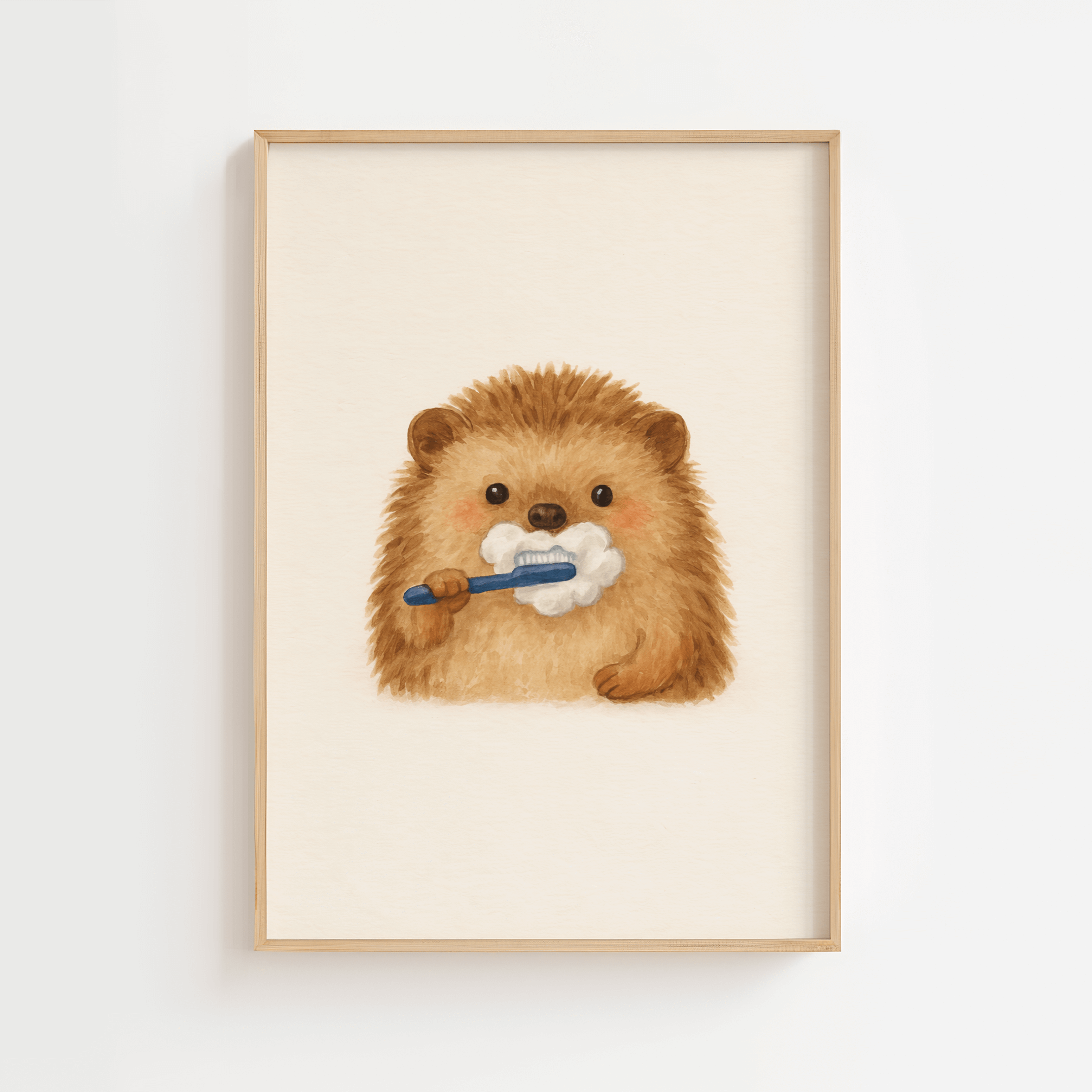 Denne charmerende plakat viser et sødt pindsvin midt i tandbørstningen – en hyggelig og genkendelig scene, der gør hverdagens rutiner lidt sjovere. Det bløde akvarel-look og de varme farver skaber et roligt og venligt udtryk, som passer perfekt til børneværelset, badeværelset eller som en sjov detalje i hjemmet.