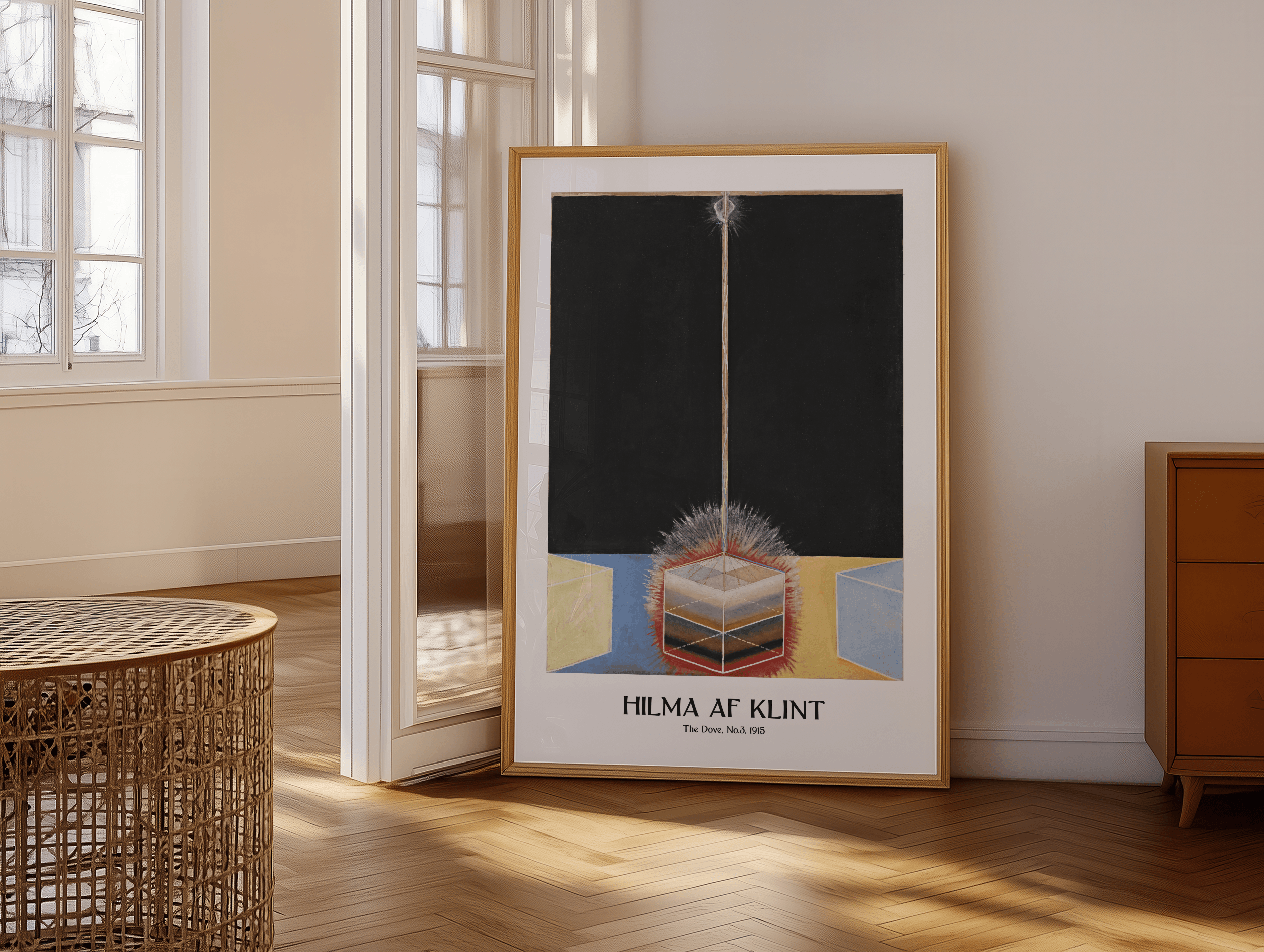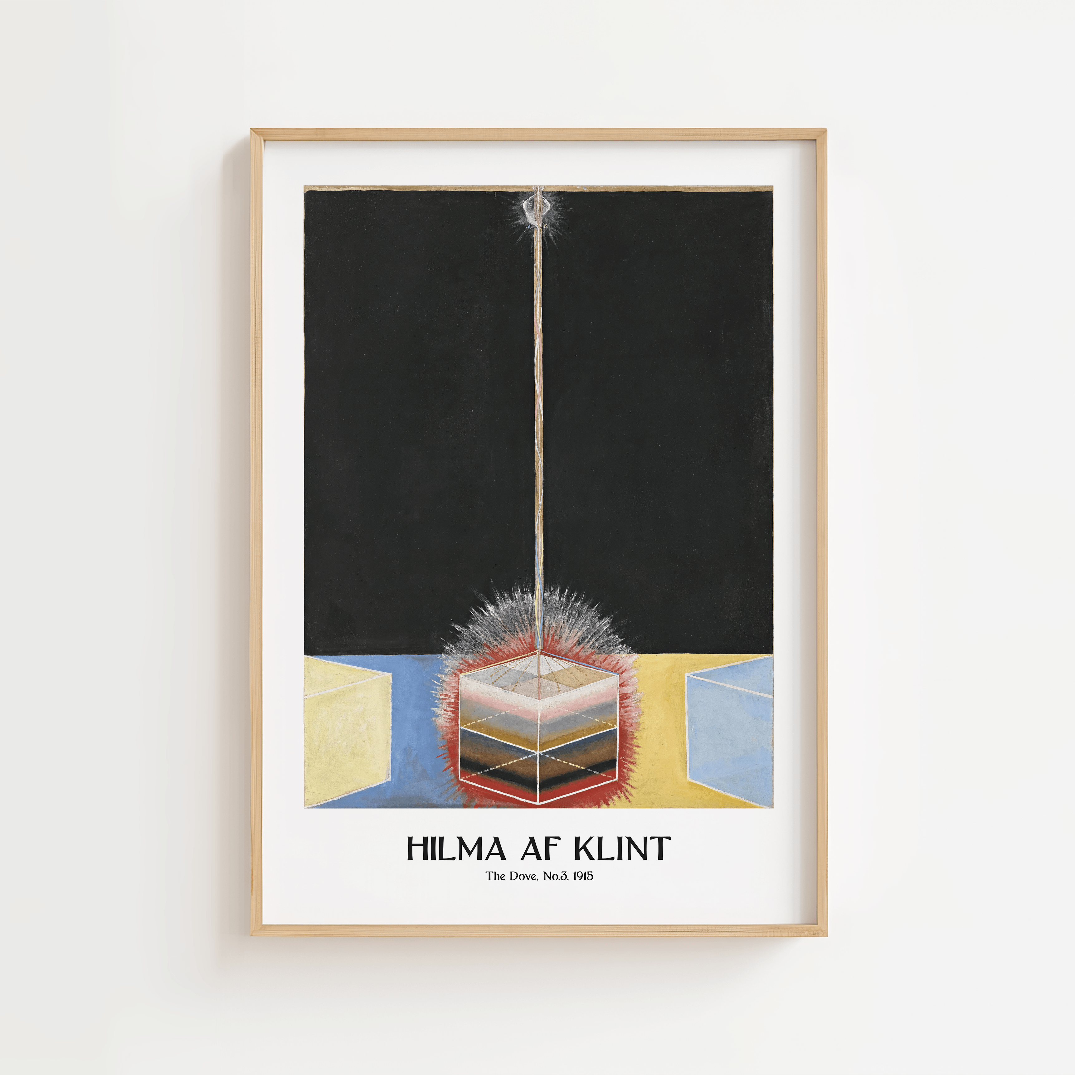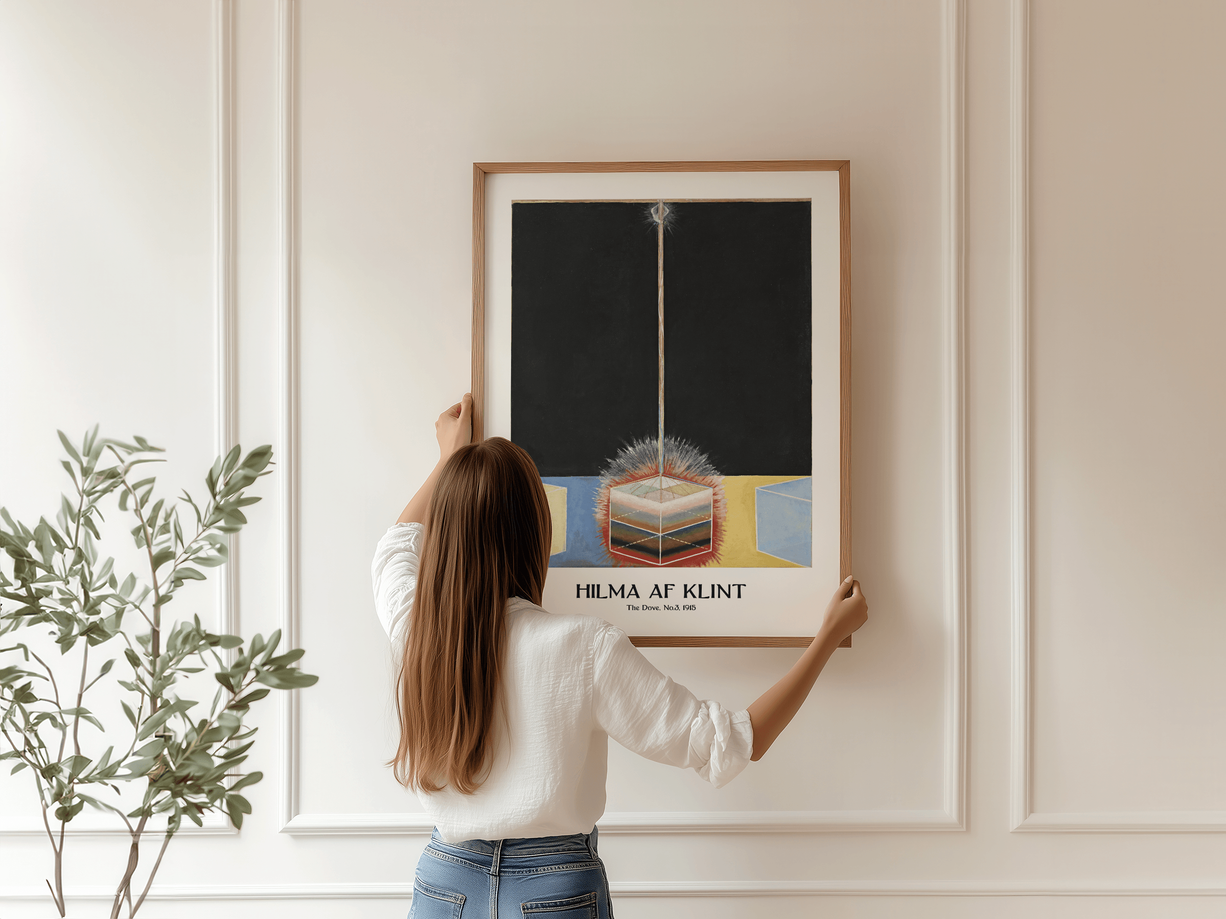 Hilma af Klint war eine Pionierin der abstrakten Kunst und arbeitete häufig mit spirituellen Symbolen, universellen Kräften und der Entwicklung des Menschen. Die geometrischen Formen und der dramatische Kontrast zwischen Dunkel und Licht verleihen der Plakat ein starkes und fast kosmisches Erscheinungsbild.
