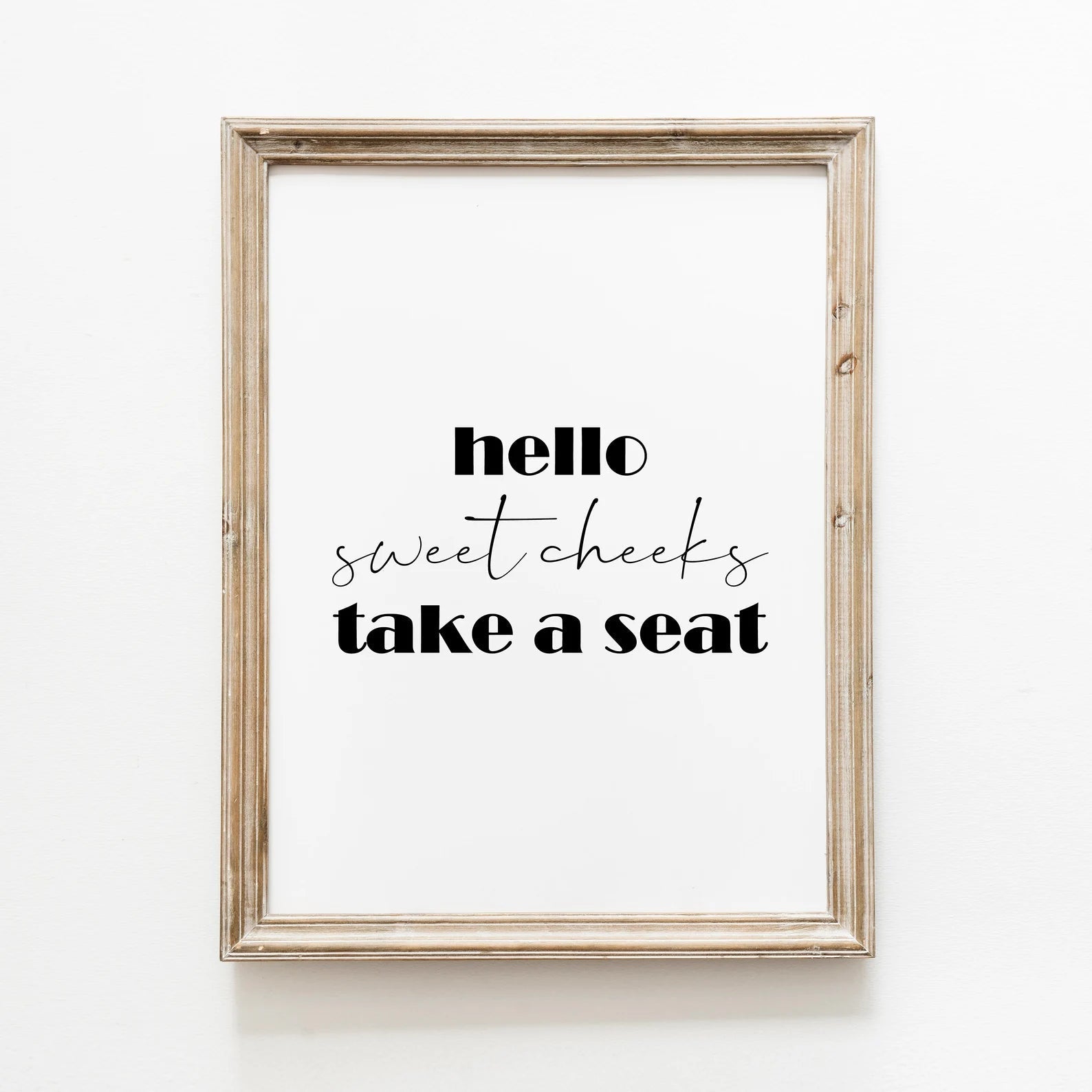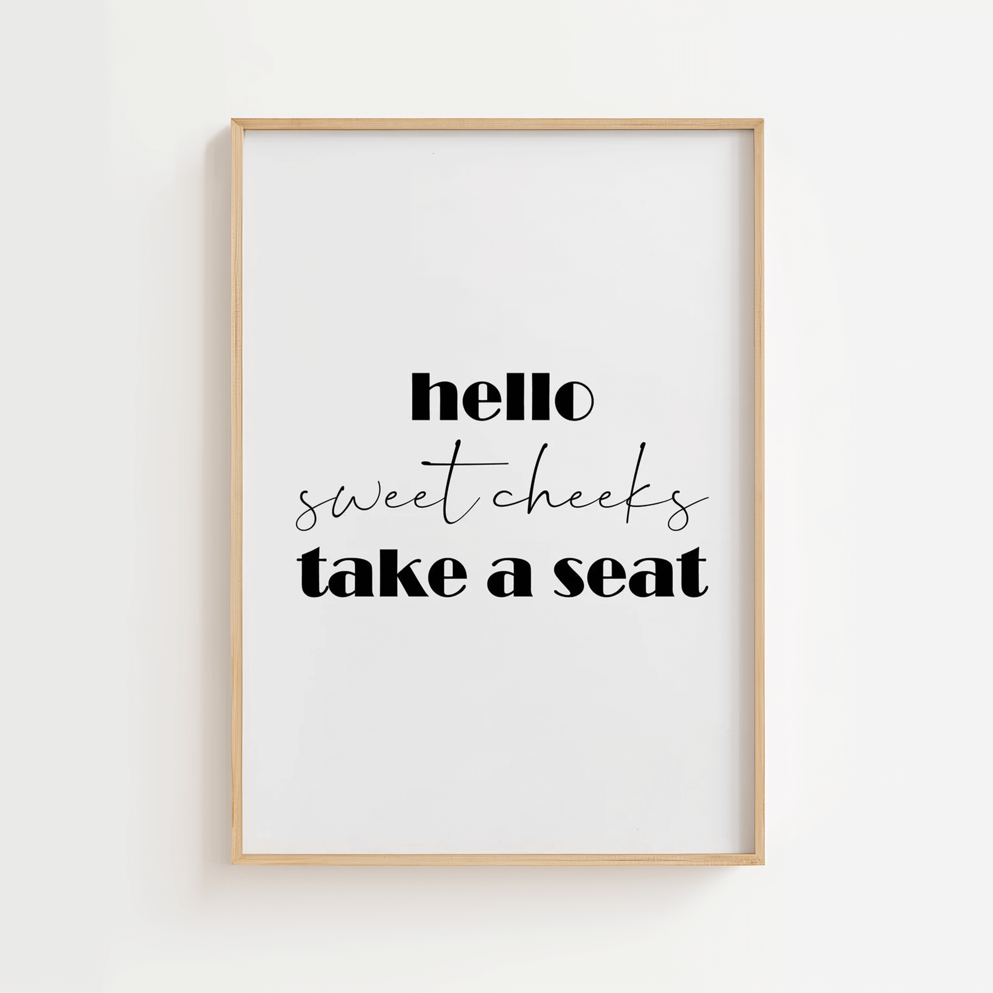 Bring humor ind i hverdagen med denne sjove plakat til badeværelset! Teksten "Hello Sweet Cheeks – Take a Seat" er både charmerende og lidt fræk, hvilket gør den perfekt til at pifte stemningen op på dit toilet. Det minimalistiske design passer ind i enhver indretning, uanset om du går efter moderne, boheme eller retro stil. En sjov gaveidé til indflytningsfesten eller bare til at forkæle dig selv. Trykt på kvalitetspapir og fås i flere størrelser.