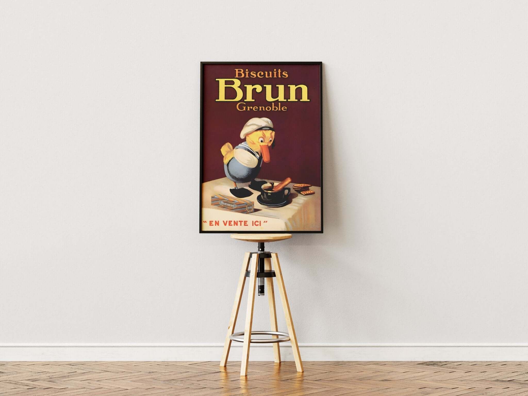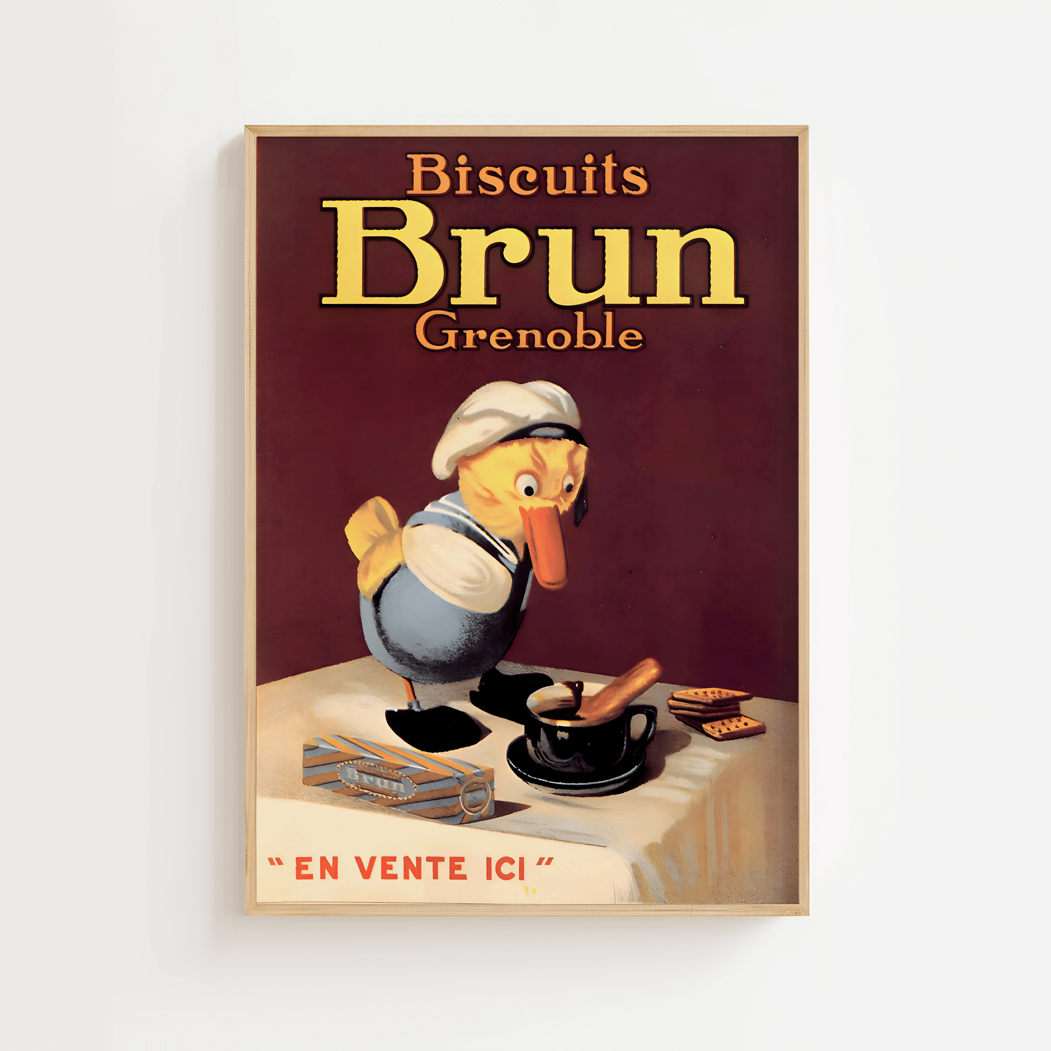 Denne franske vintage plakat reklamerer for Biscuits Brun fra Grenoble og udstråler klassisk madglæde med et humoristisk twist. Motivet viser en lille rund kok, der læner sig hen over bordet, klar til at dykke ned i en skål – omgivet af kaffe og lækre småkager. Plakatens varme farver og finurlige illustration gør den oplagt til at hænge i køkkenet, over morgenmadsbordet eller i en hyggelig café. Den udstråler nostalgi, fransk charme og kærlighed til det søde køkken. En sjov gave til madelskere, frankofile og fans af vintage madreklamer.
