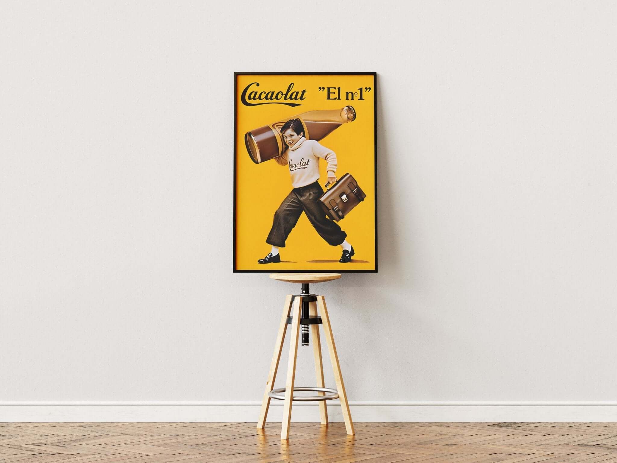 Denne charmerende vintage plakat reklamerer for den klassiske spanske kakaomælk Cacaolat med teksten "El nº1". Motivet forestiller et glad skolebarn med en stor Cacaolat-flaske over skulderen og en lædertaske i hånden – klar til en ny dag. Plakaten har en varm gul baggrund og et legende design, som emmer af nostalgi, glæde og retrocharme. Perfekt til at bringe farve og personlighed ind i køkkenet, børneværelset eller som en del af en retro-inspireret billedvæg. En skøn gaveidé til kakaoelskere eller fans af klassisk europæisk reklame.