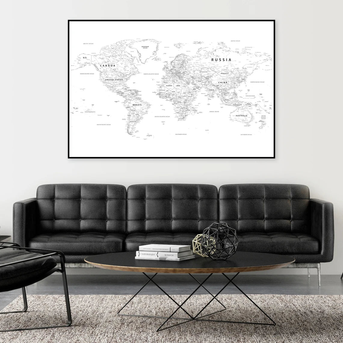 Denne stilrene verdenskort plakat fungerer smukt alene eller som en del af en større billedvæg, hvor du ønsker at tilføre et globalt præg uden at forstyrre rummets ro.