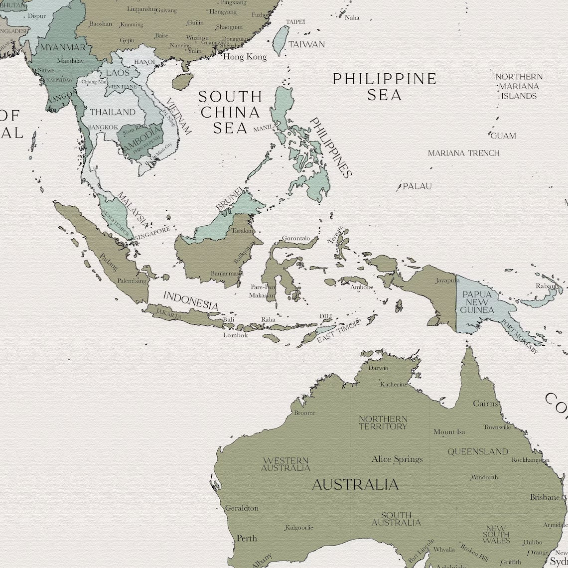 Moderne Verdenskort Plakat kombinerer stilren æstetik med tidløs elegance. Med sit minimalistiske design og klare konturer passer denne plakat perfekt ind i moderne hjem, skandinavisk indretning og kontormiljøer.