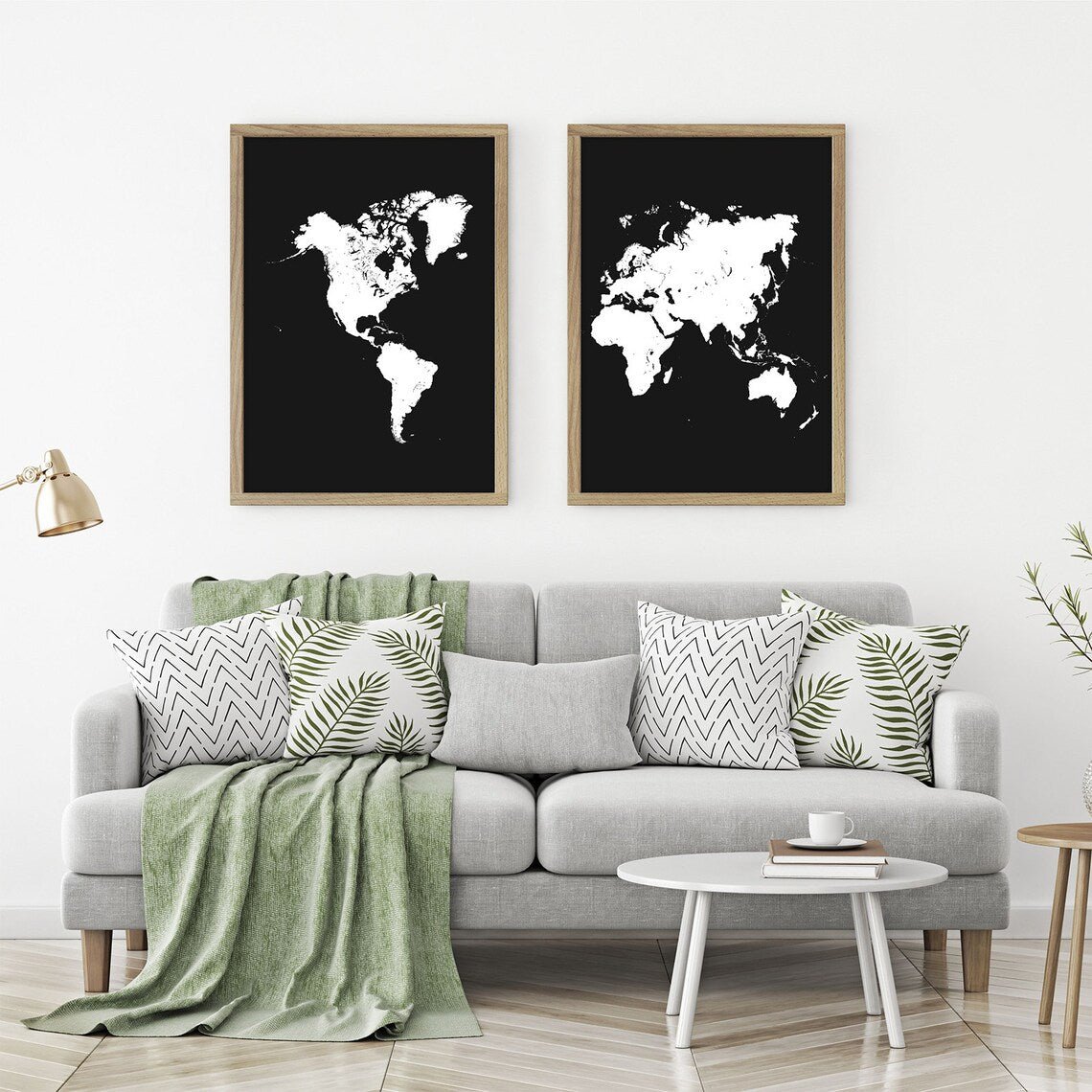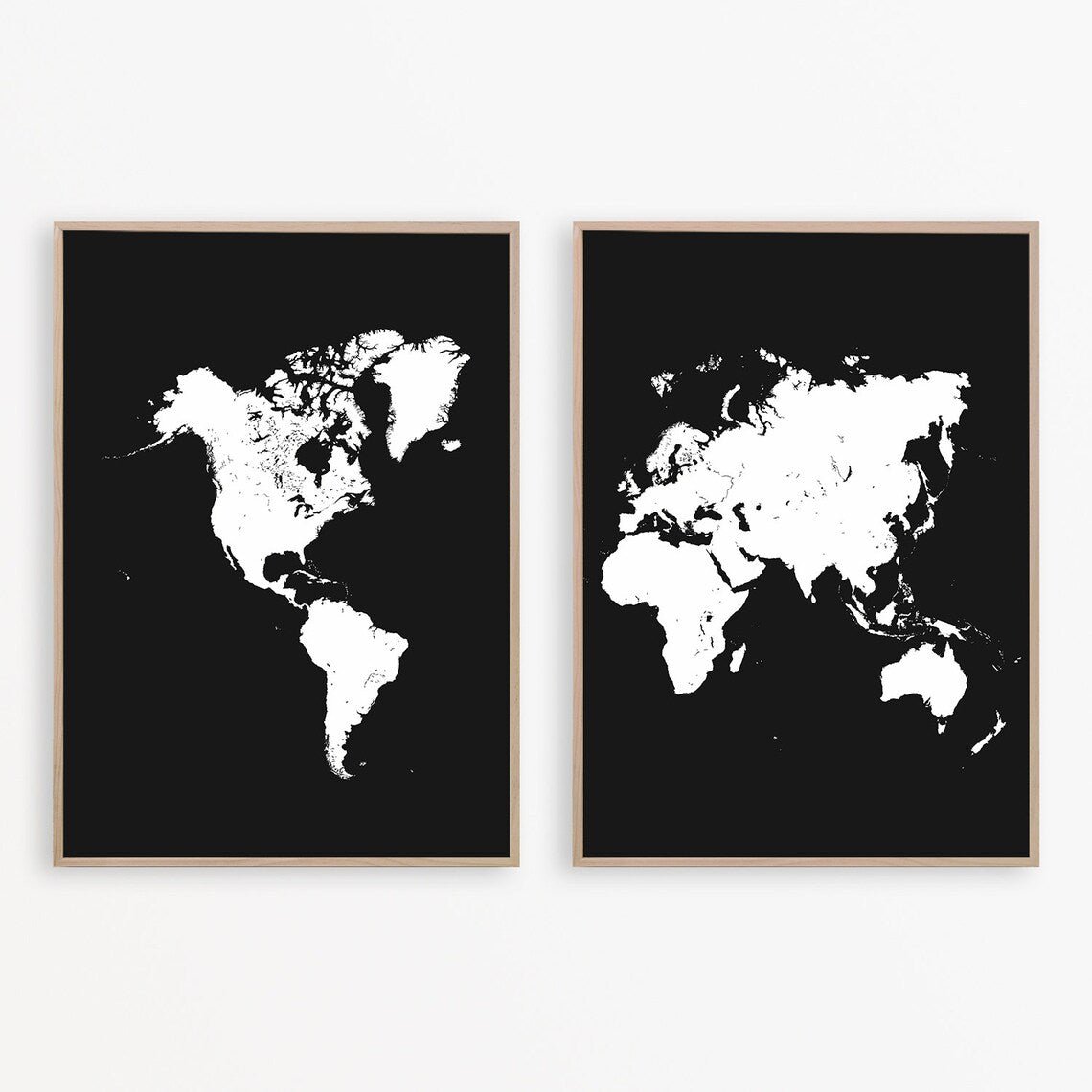 Sort 2 delt Verdenskort Plakat er en moderne og stilfuld plakat, perfekt til dig, der ønsker et sofistikeret, grafisk udtryk på væggen. Motivet består af to separate plakater, der tilsammen danner et detaljeret og minimalistisk verdenskort i sort-hvid.