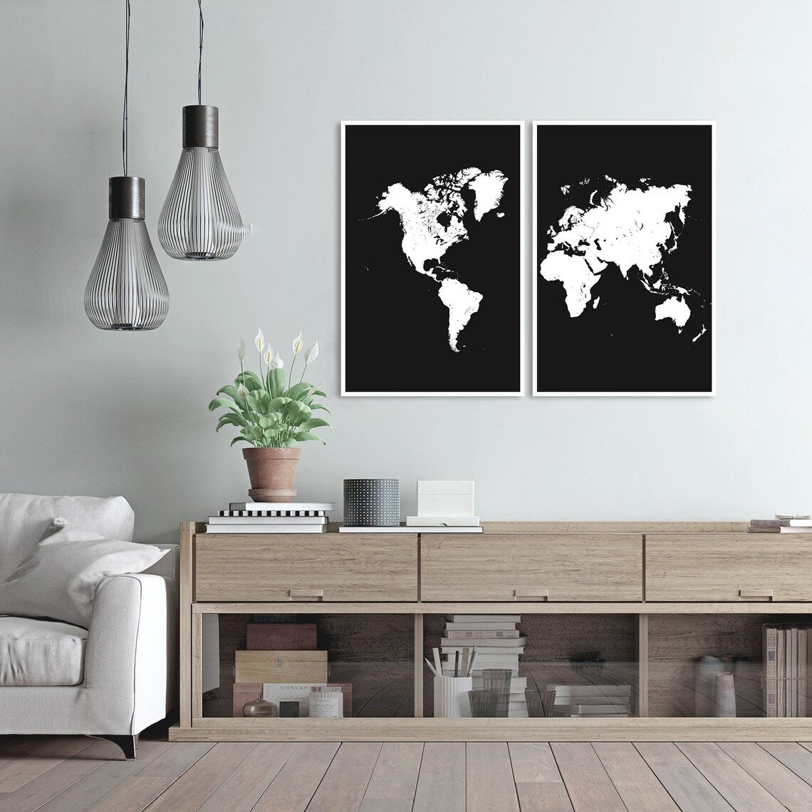 Denne verdenskort plakat er ideel til store vægge i stuen, på kontoret eller i entreen, hvor det todelte design skaber en dynamisk og elegant effekt.