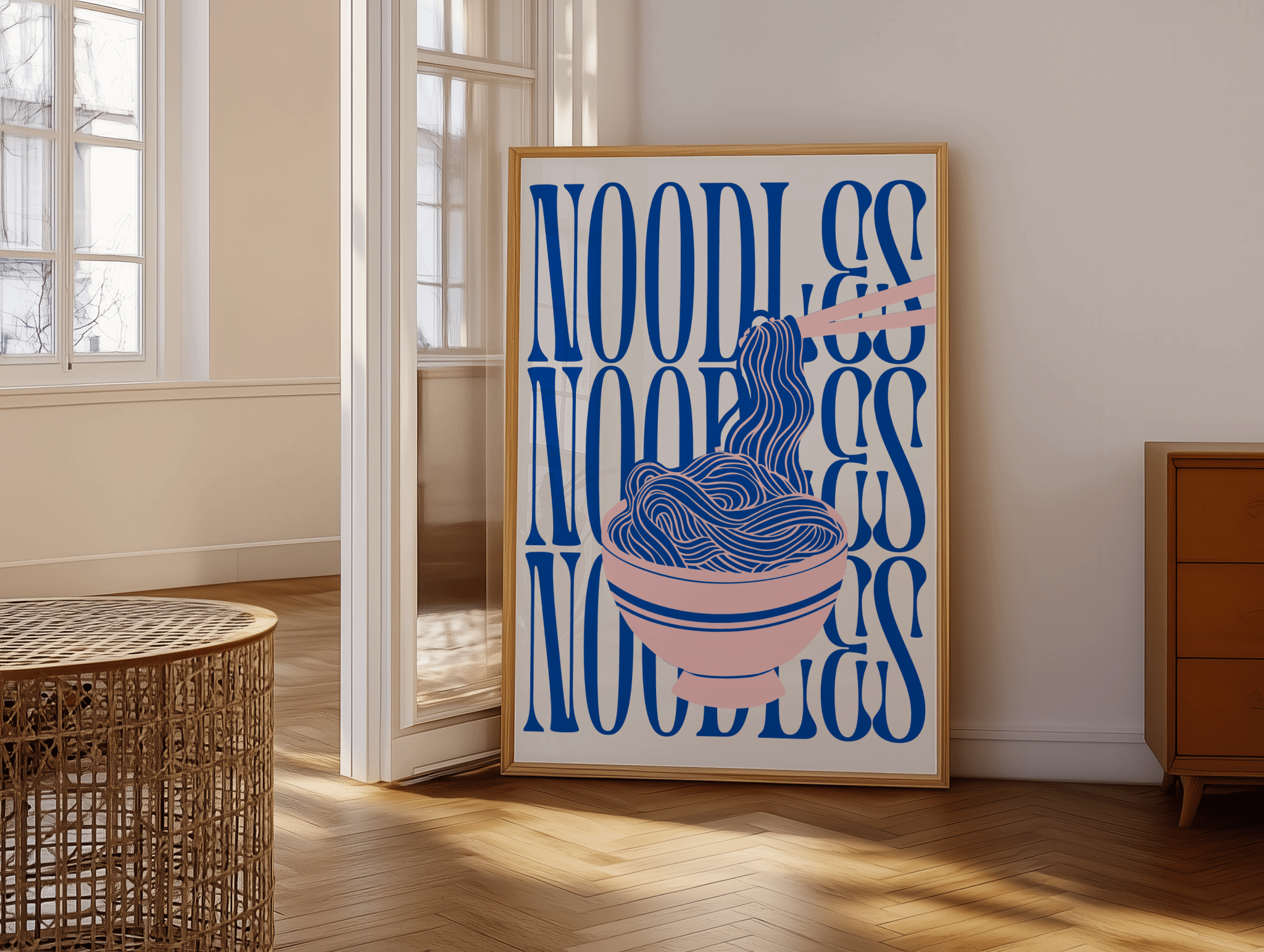 Plakaten kombinerer legende pop-art æstetik med et moderne minimalistisk udtryk, der passer perfekt til køkkenet, spisestuen eller en billedvæg med madinspirerede plakater. Den er ideel for noodle lovers, der vil vise deres passion for ramen, pasta eller nudler på en stilfuld og sjov måde.