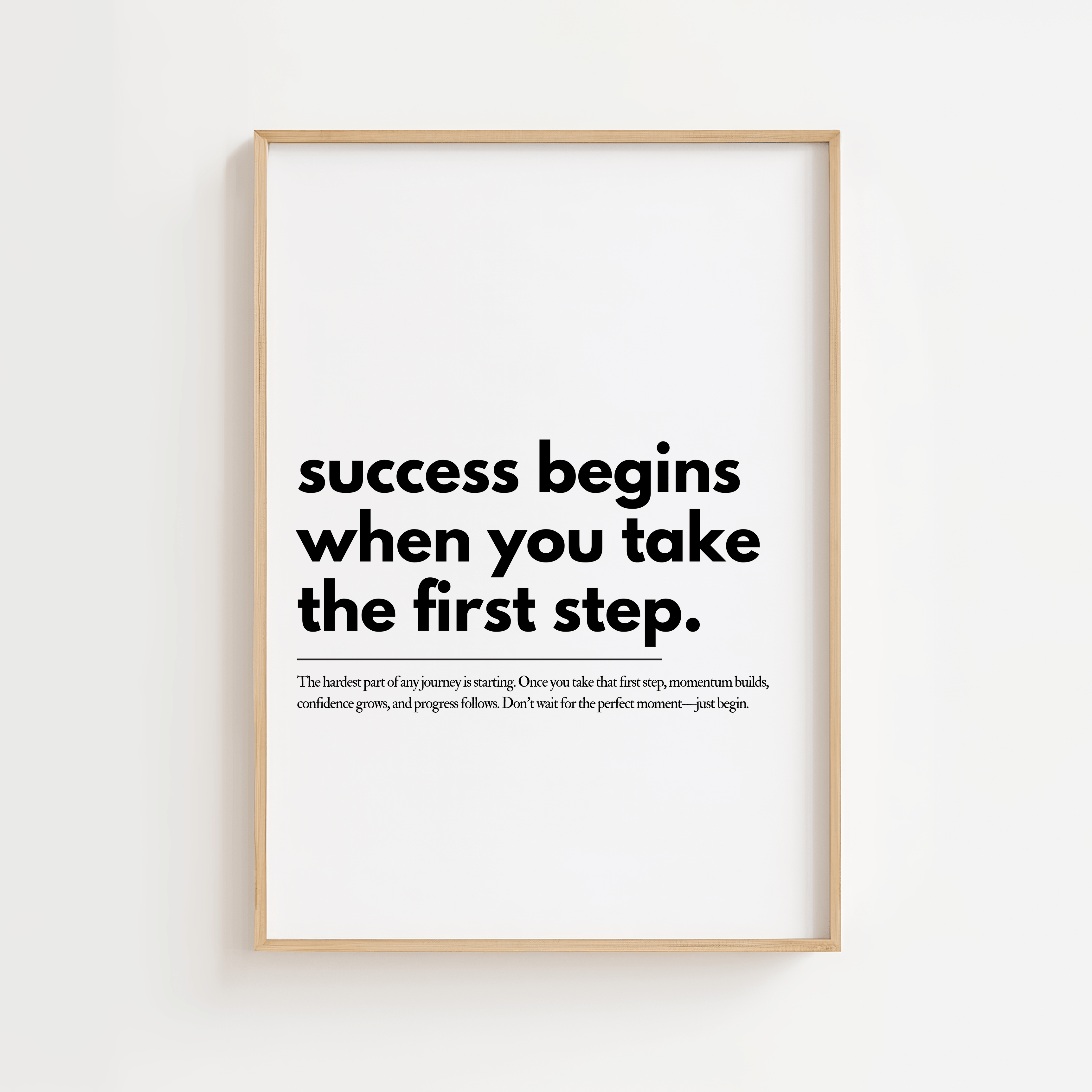 Denne motiverende plakat med citatet “Success begins when you take the first step” minder dig om, at enhver rejse starter med et enkelt skridt.